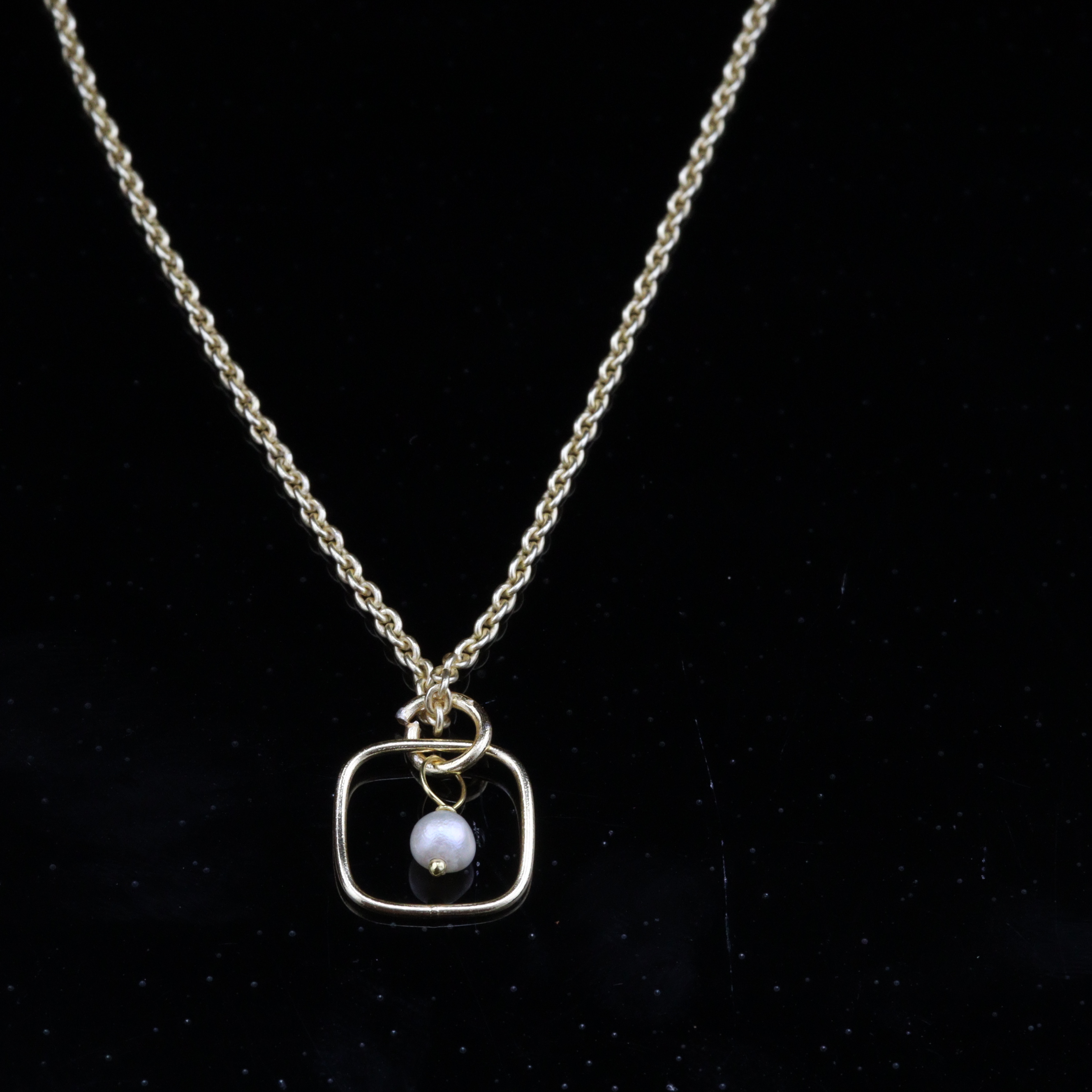 This Square Charm with Pearl Necklace beautifully blends modern minimalism with timeless sophistication. Crafted from solid brass and plated in luxurious 22K gold, it features a sleek geometric square charm paired with a luminous pearl accent that adds soft, refined elegance. At 18 inches, the necklace rests gracefully along the collarbone, offering a contemporary yet classic accessory suitable for both daily wear and special occasions. Handmade by skilled artisans, it carries a unique charm and polished finish.