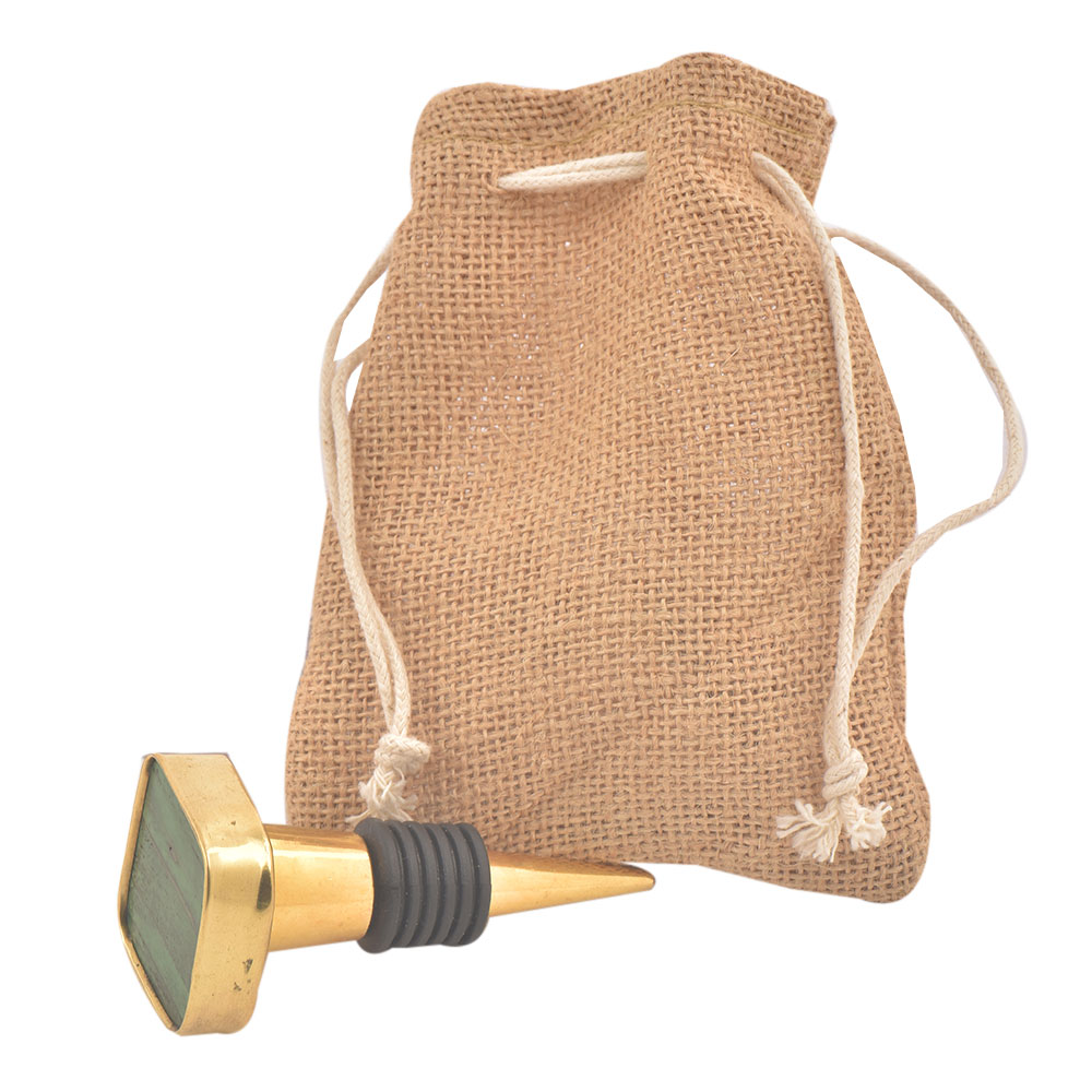 Square Sea Green Bone And Metal Wine Stopper . Zinc Alloy Wine Bottle Stopper with Attractive Jute Bag Packaging.