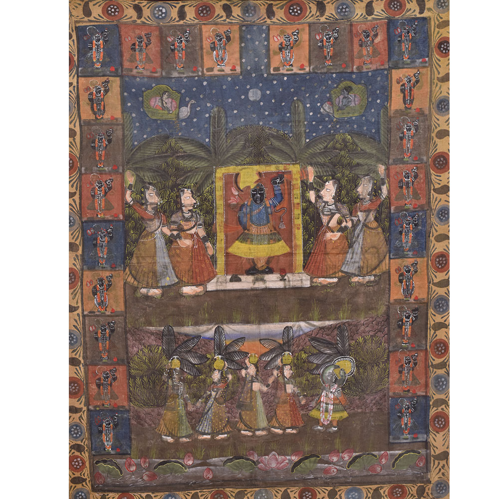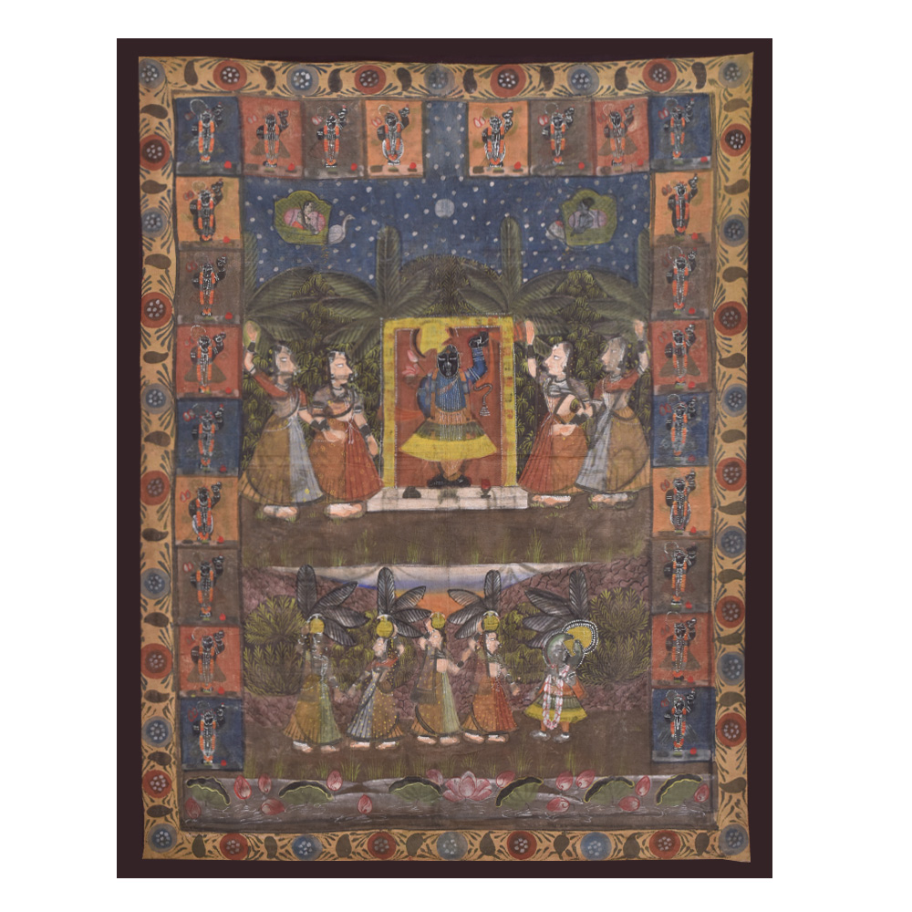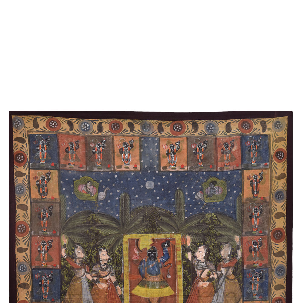 Pichwai painting of Sreenathji in various shringar forms hand painted on a cloth fabric. It has two borders hand painted by local artisans of Nathadwara using natural stone colors which are used for painting. Wall Art , living room decoration, temple decoration Hotel and restaurant wall decoration, Diwali gift, Christmas gift, house warming gift for the near and dear ones.