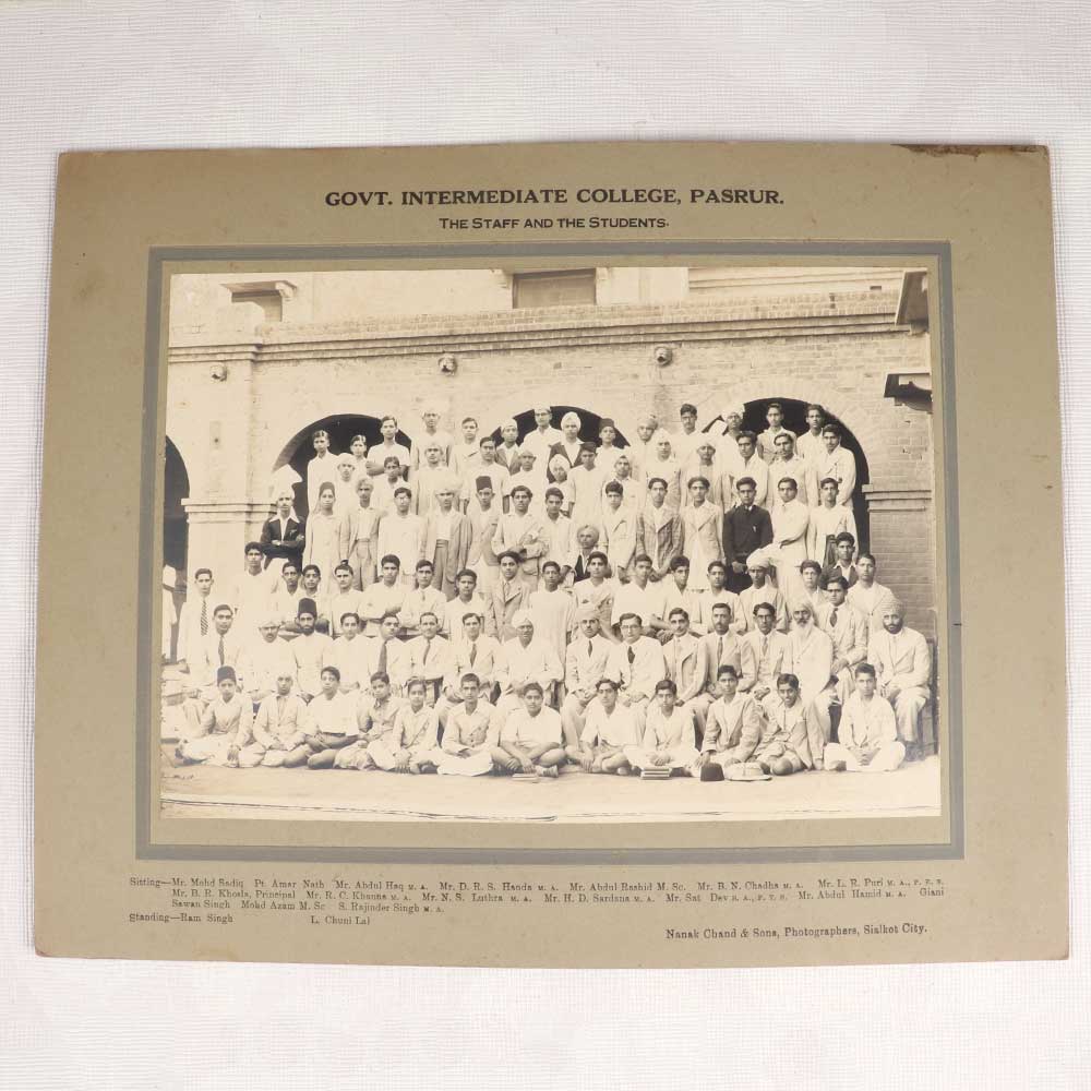 Travel back in time with this stunning vintage black and white photograph titled "Govt. Intermediate College, Pasrur" capturing "The Staff and Students" in a bygone era. This evocative image immediately transports you to a simpler time, inviting you to imagine the stories behind the faces staring back at you. This nostalgic photograph provides a glimpse into the past, showcasing the staff and students of this intermediate college in Pasrur. Their classic attire and stoic poses reflect styles and customs of the time. As you study the faces, you can't help but wonder about their lives, dreams, and experiences. Displaying this photograph is sure to spark meaningful conversations about local history and days gone by. Ideal for history buffs, those with connections to Pasrur, or anyone who appreciates vintage photography, this evocative black and white image makes a thoughtful gift and striking decorative accent. Let it transport you back in time every time you look at it.