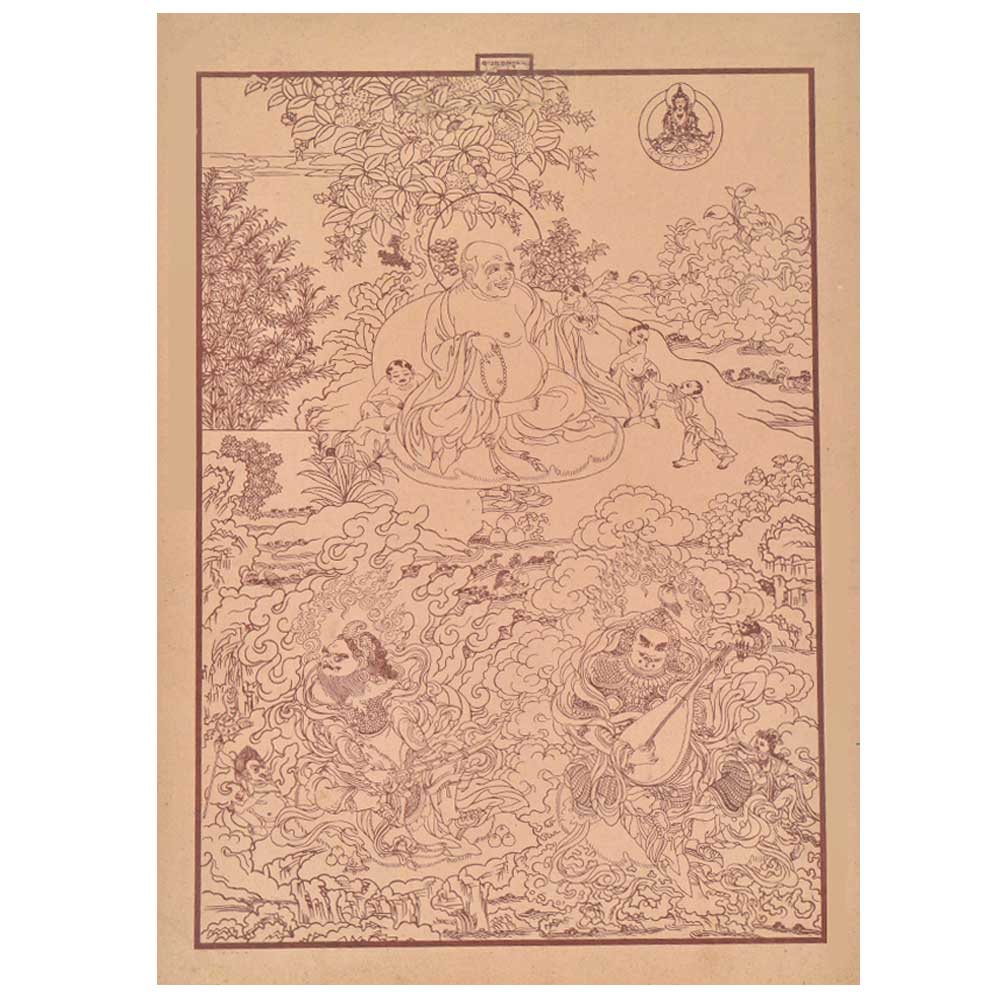 An old painting of Big belly buddha seated in the on a bed of grass with demons and other aspects of life. Buddha Shakyamuni taught in The Larger and Smaller Sukhavati Sutras, many ages ago the monk Dharmakara vowed that once he attained Buddhahood, all who believed in him and called upon his name could be born into his paradise (the Pureland) and reside there until achieving Nirvana