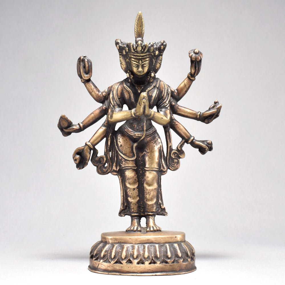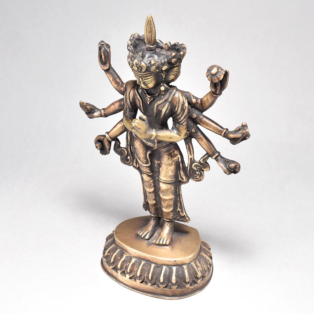 Bring the enchanting essence of Tibetan spirituality into your home with this exquisite 8-arm Lord Avalokiteshvara statue.This captivating 8-arm Lord Avalokiteshvara statue is a masterful work of Tibetan art that will transport you to the mystical realm of Buddhist spirituality. Meticulously crafted from durable brass, this piece features the revered bodhisattva in an intricate, multi-armed pose that symbolizes his infinite capacity to help all sentient beings. Whether used as the centerpiece of your puja altar or displayed prominently in your living space, this statue will imbue your environment with a profound sense of calm, wisdom, and compass Handcrafted from premium brass for a stunning, antique appearance Detailed depiction of the bodhisattva of compassion in traditional Tibetan Buddhist art Versatile design makes it perfect for use in puja rituals or as eye-catching home decor Imbued with the sacred energy of Tibetan Buddhism to inspire peace and enlightenment