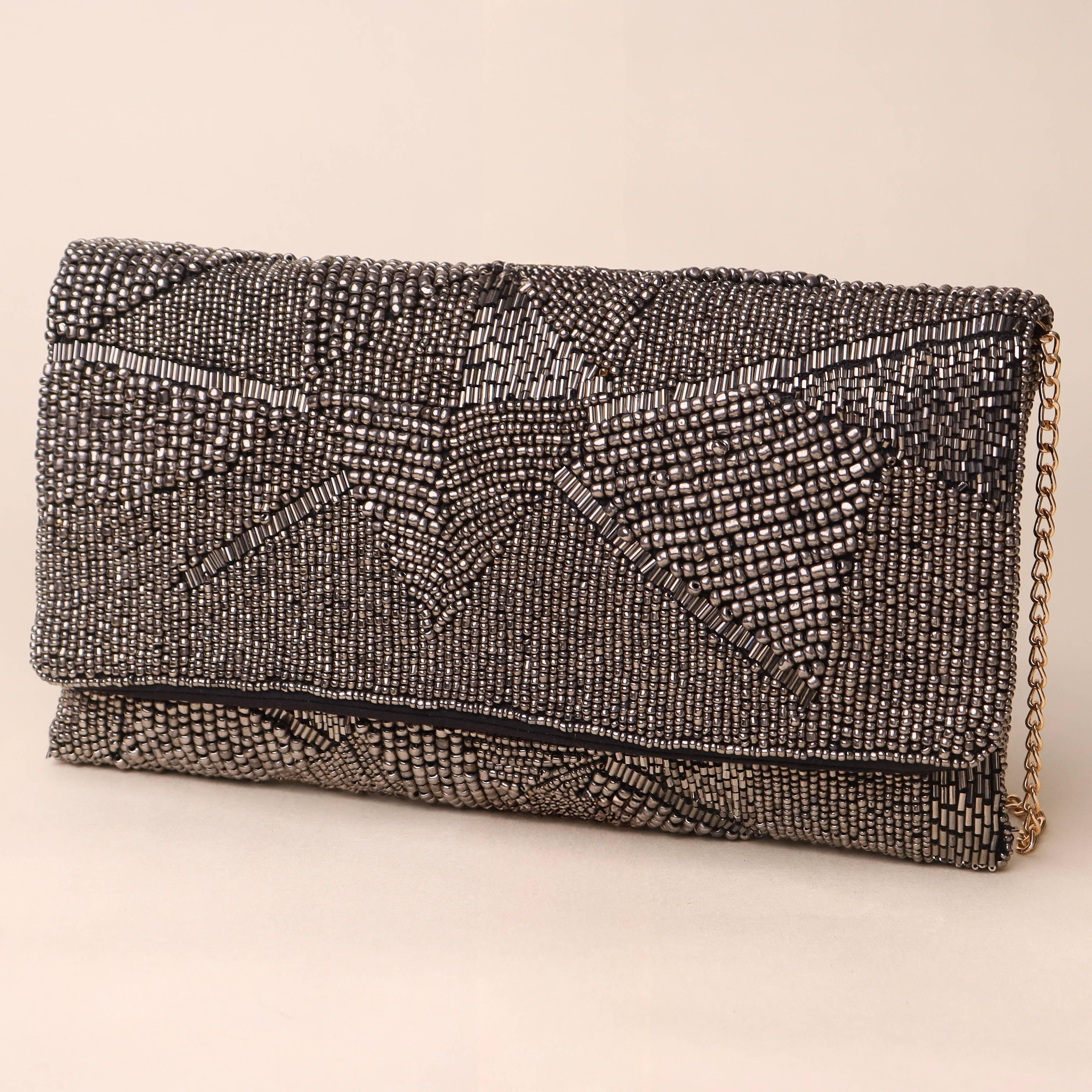 Embrace modern glamour with this stunning hand-beaded sling bag, featuring an abstract geometric design in metallic silver and black. The intricate beadwork creates a textured, starlit effect, making it a true statement accessory for evening outings and special occasions. The detachable gold-tone chain strap adds versatility, allowing you to wear it as a crossbody or shoulder bag, or carry it as a sleek clutch. Perfect for cocktail nights, weddings, and formal gatherings.