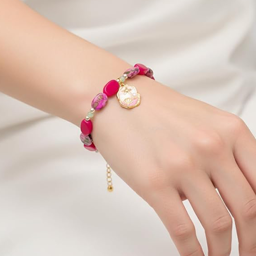 The bold pink-red tones paired with a floral pearl charm celebrate vibrancy, making this bracelet a symbol of joy and elegance.