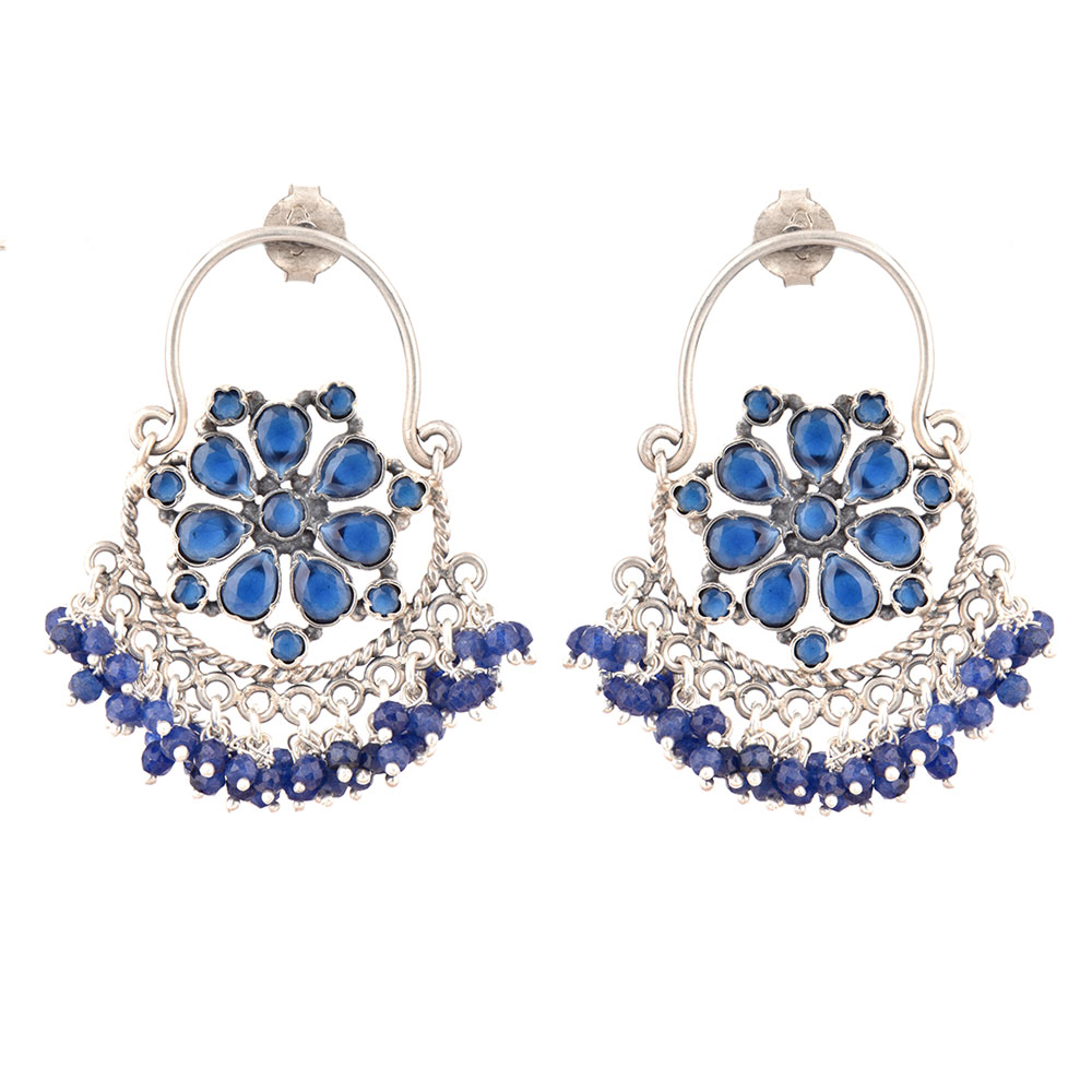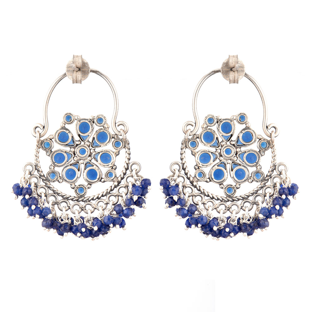 Enhance your look with this traditionally handmade 92.5 sterling silver dangling earring pair that looks stunning with several natural blue colored beads hanging at the bottom of the centre piece is preciously suitable for all kinds of dressy occasions. Perfectly suited for Wedding, Ethnic, Festive Party wear.
