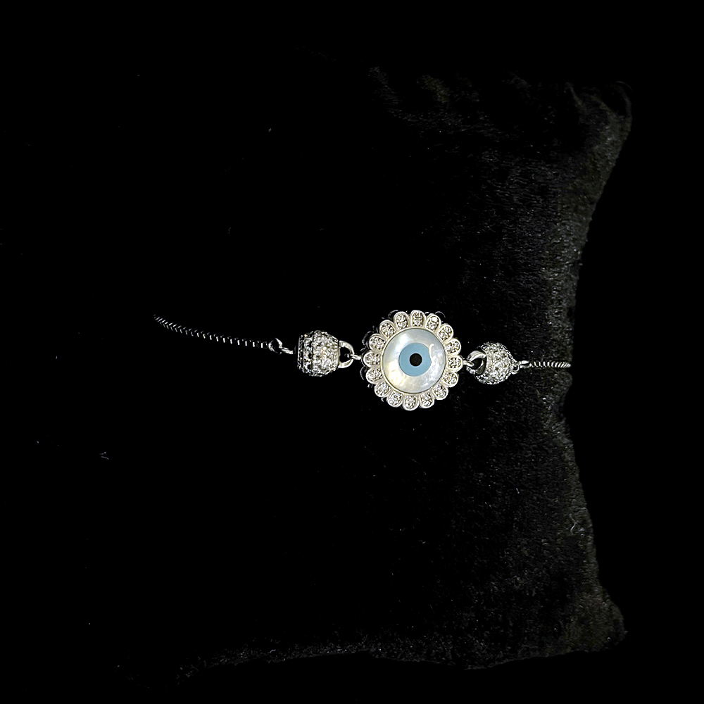 The bracelet presents a circular floral arrangement surrounding the evil eye motif, offering a harmonious blend of symbolism and decorative detailing. The design feels composed and graceful, making it suitable for regular styling without appearing heavy.