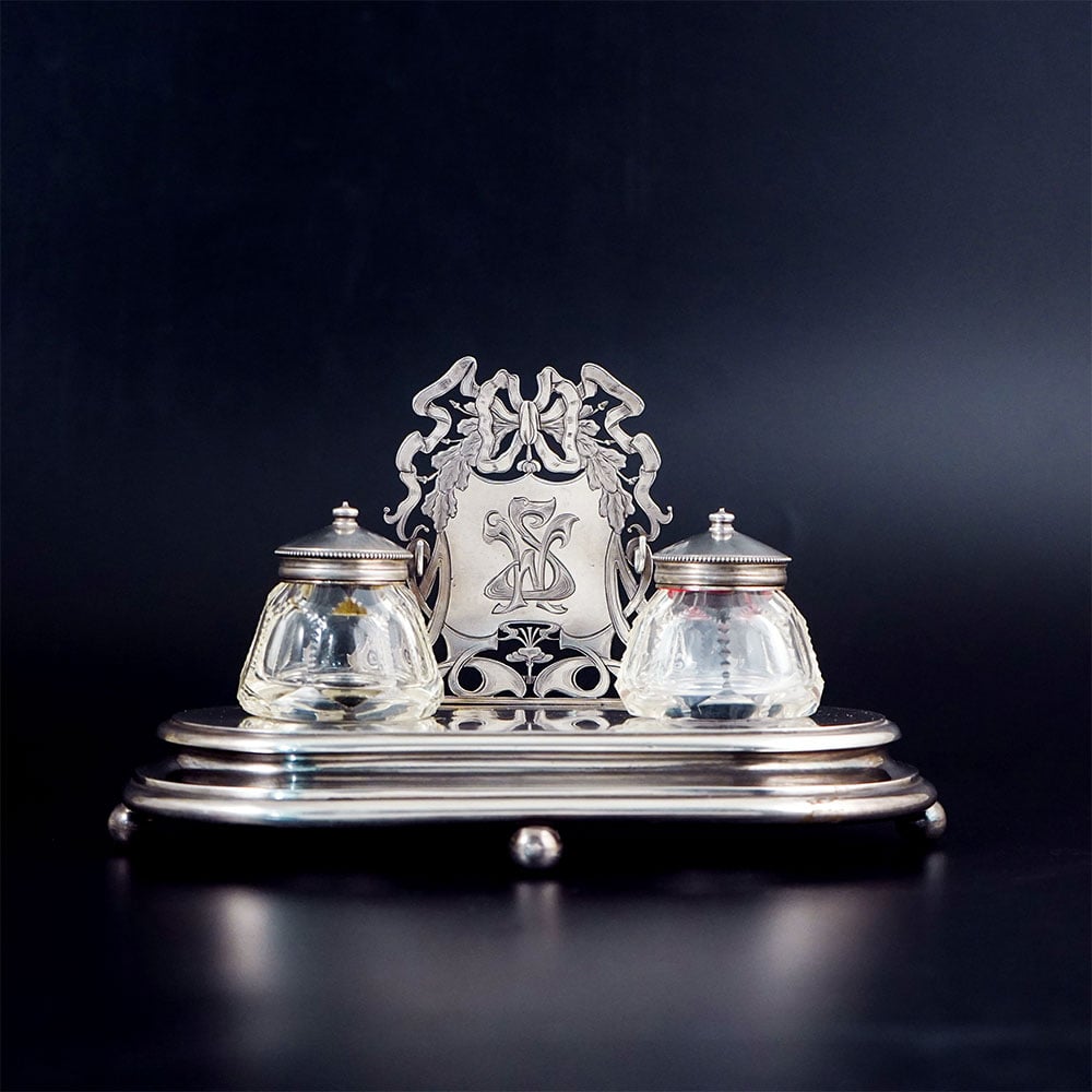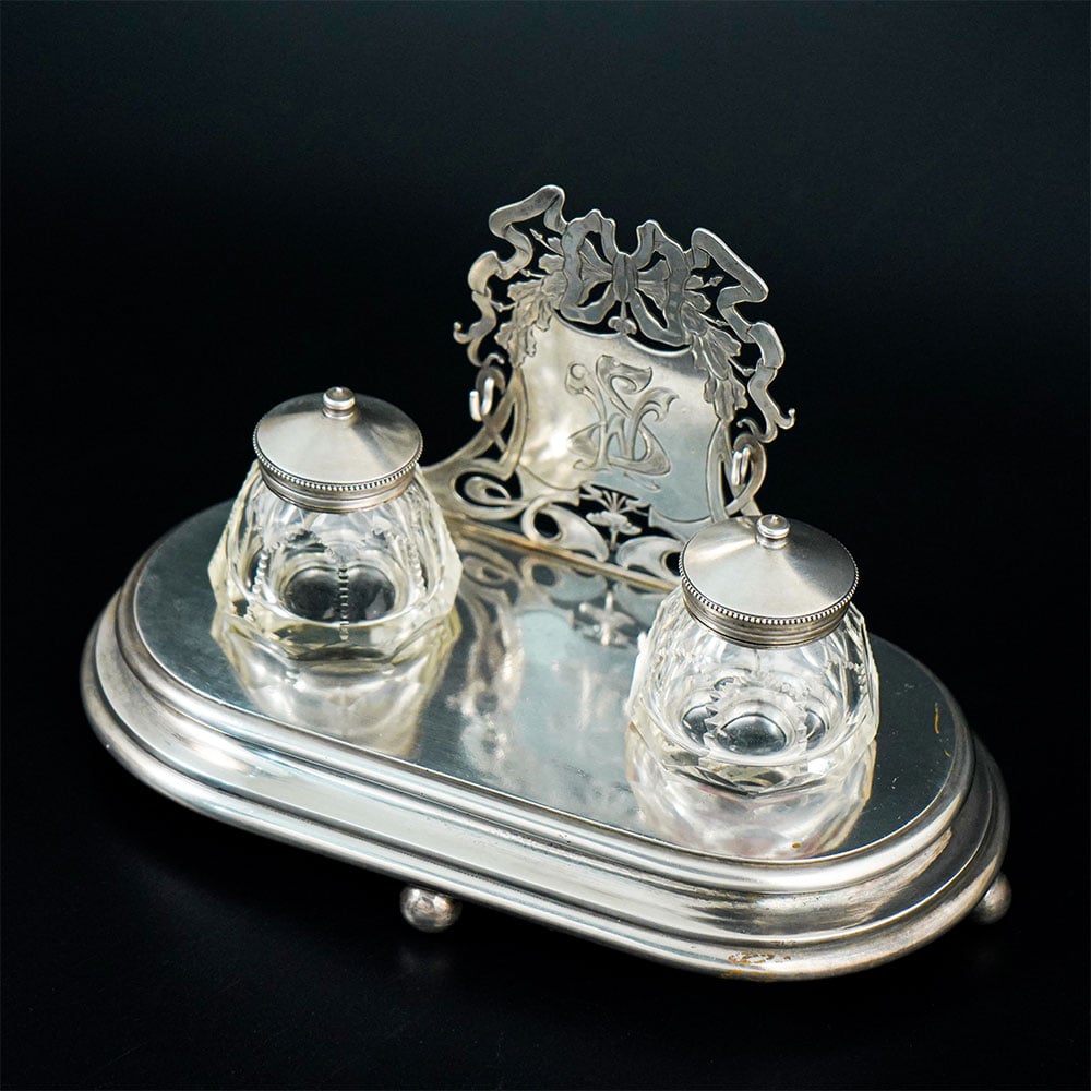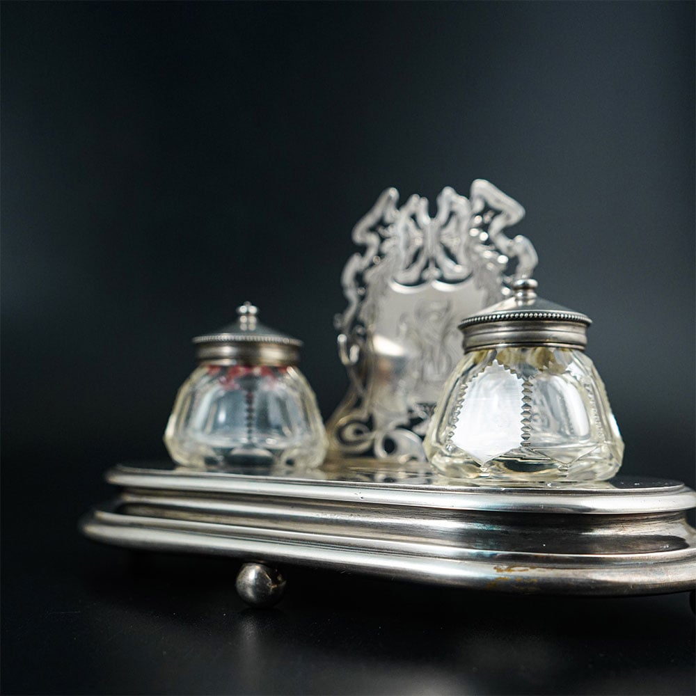 This elegant handcrafted sterling silver inkstand desk set combines classic craftsmanship with refined desk decor. Made from sterling silver, the piece features a polished oval base that supports two crystal inkwells along with a decorative backplate, creating a timeless writing accessory inspired by traditional executive desk sets. The inkwells are crafted from clear faceted crystal, allowing the ink containers to catch and reflect light beautifully while maintaining a sophisticated appearance. Each crystal bottle is topped with a sterling silver lid, designed with subtle beaded detailing around the edges that complements the smooth silver tray beneath. The oval sterling silver base stands on small rounded feet, giving the set a stable and elevated presentation. At the back of the tray, an ornate sterling silver decorative panel rises gracefully, featuring intricate scrollwork and a central engraved monogram design. This decorative element adds character to the set while reinforcing its classic antique-inspired aesthetic. Designed originally for writing desks and study tables, this sterling silver inkstand now serves as both a functional writing accessory and a collectible decorative object. It works beautifully as a centerpiece for executive desks, vintage office decor, or curated silver collections.