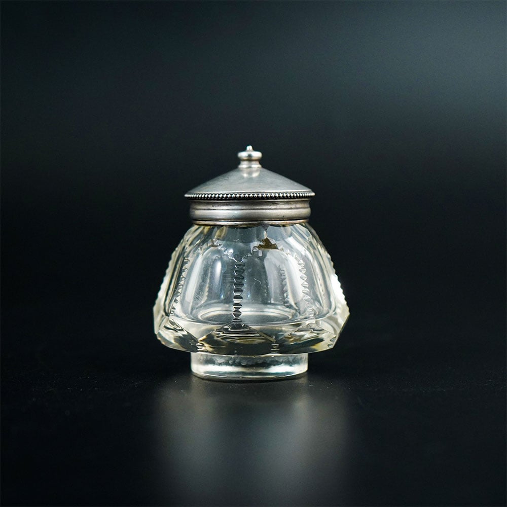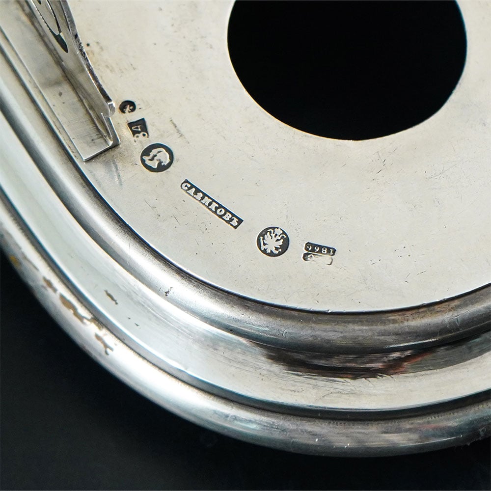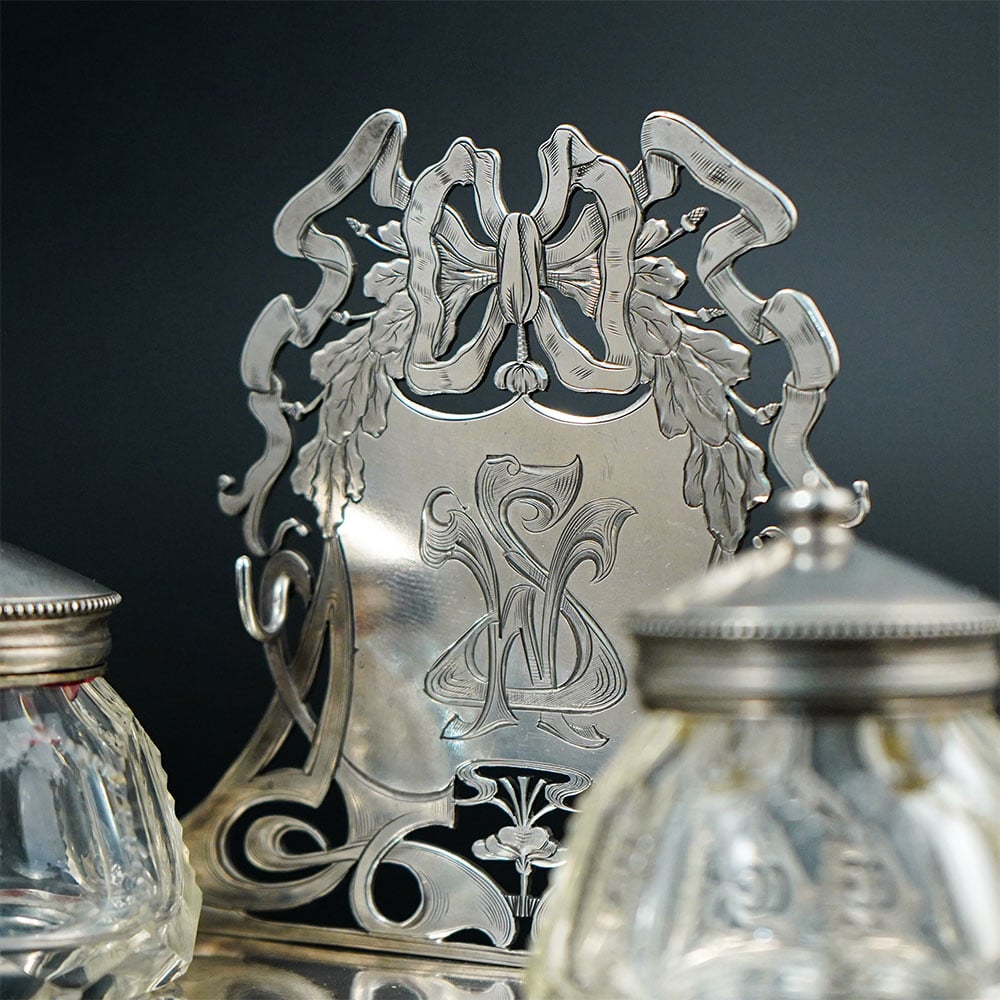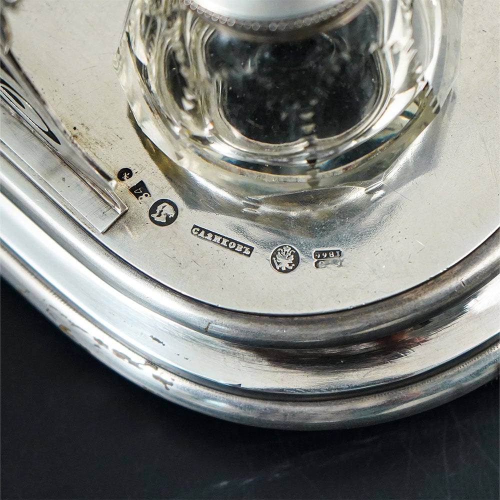 This elegant handcrafted sterling silver inkstand desk set combines classic craftsmanship with refined desk decor. Made from sterling silver, the piece features a polished oval base that supports two crystal inkwells along with a decorative backplate, creating a timeless writing accessory inspired by traditional executive desk sets. The inkwells are crafted from clear faceted crystal, allowing the ink containers to catch and reflect light beautifully while maintaining a sophisticated appearance. Each crystal bottle is topped with a sterling silver lid, designed with subtle beaded detailing around the edges that complements the smooth silver tray beneath. The oval sterling silver base stands on small rounded feet, giving the set a stable and elevated presentation. At the back of the tray, an ornate sterling silver decorative panel rises gracefully, featuring intricate scrollwork and a central engraved monogram design. This decorative element adds character to the set while reinforcing its classic antique-inspired aesthetic. Designed originally for writing desks and study tables, this sterling silver inkstand now serves as both a functional writing accessory and a collectible decorative object. It works beautifully as a centerpiece for executive desks, vintage office decor, or curated silver collections.