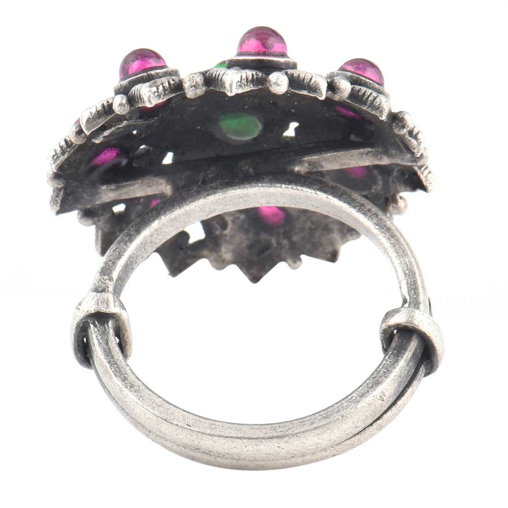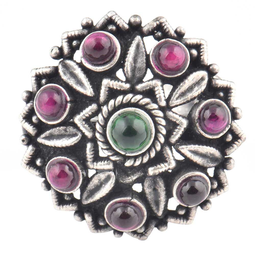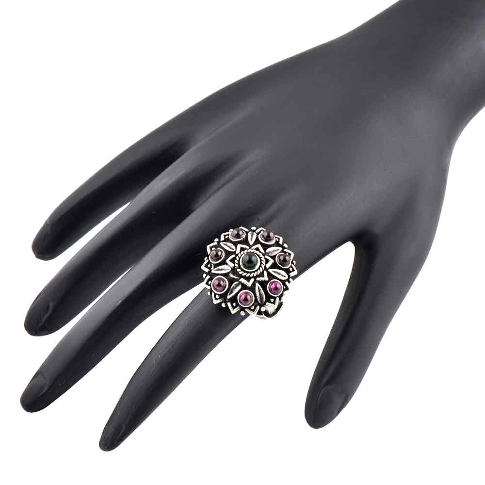 Stoned Floral 92.5 Sterling Silver Ring Adjustable Amethyst and Onyx Stones (Free Size)