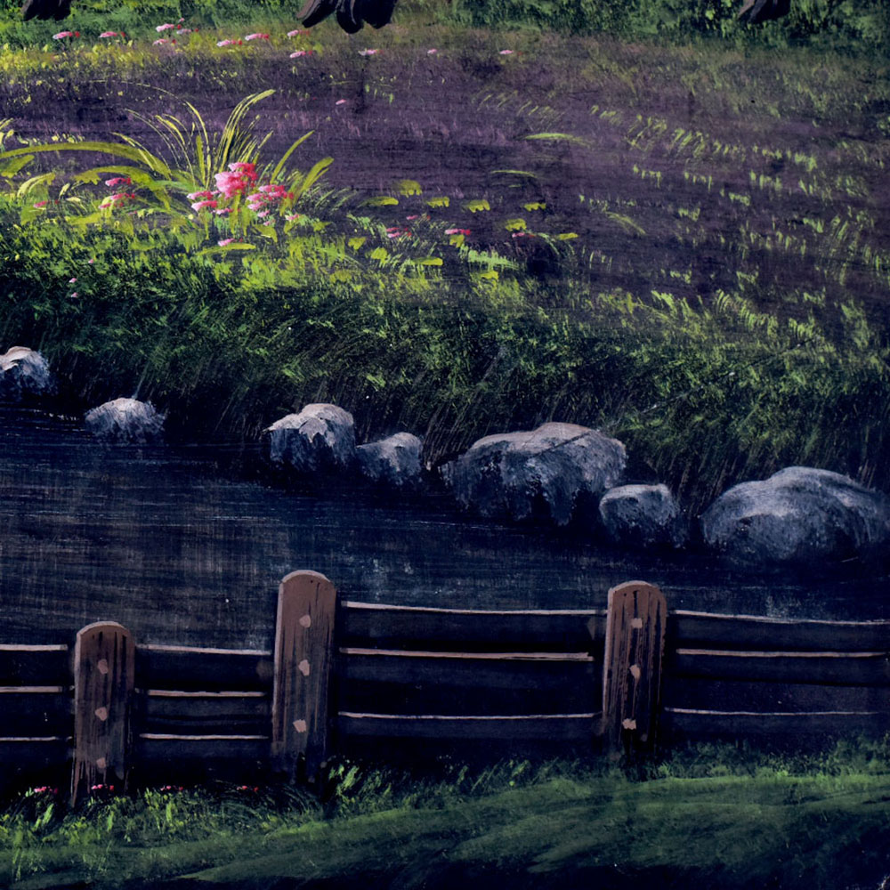 - Showcases a breathtaking scene of rolling hills, a babbling brook, and lush greenery