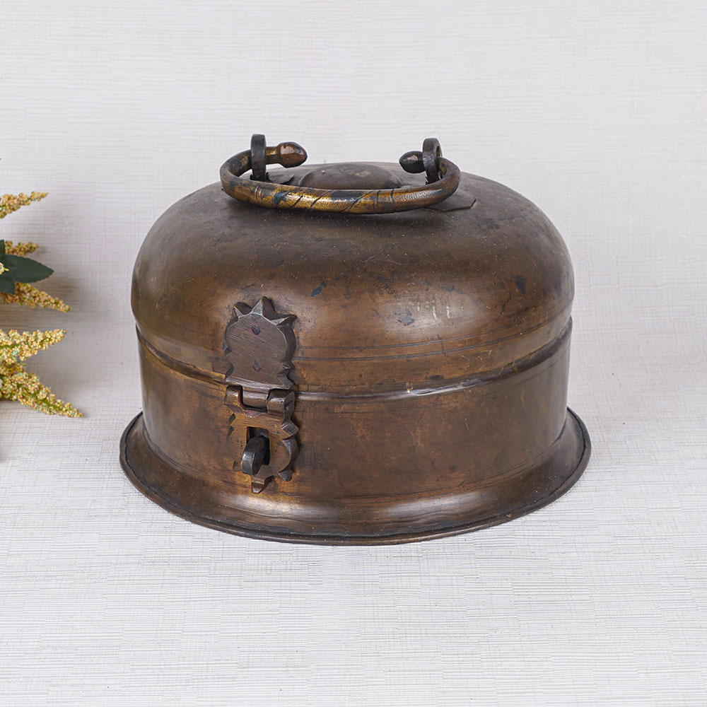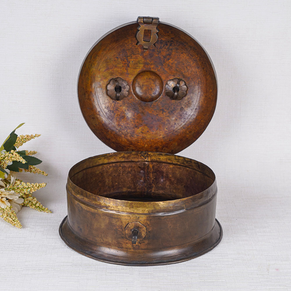 This handmade brass round jewelry box is an exquisite piece of art made with precision and care by highly skilled Indian artisans using traditional techniques. Constructed from high-quality brass, it showcases a rich brown finish that exudes elegance. Originally used to safeguard valuable possessions and jewelry, this versatile box can now serve as a stylish storage solution for your cherished items or precious stones. With its simplistic design, the box features a secure latch for locking and a convenient handle on the top for easy portability. It is a splendid decorative piece suitable for enhancing the ambiance of homes, offices, restaurants, or hotels. Its timeless beauty makes it an excellent exhibit for museums or exhibitions. Furthermore, this brass jewelry box serves as a perfect gift for special or festive occasions, delighting your family, friends, or relatives. Discover the ultimate women's jewelry box that combines functionality and aesthetics with this best-in-class brass jewelry box.