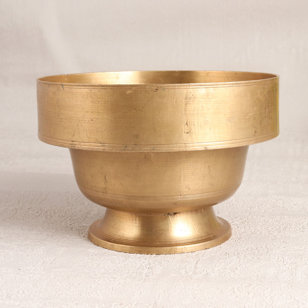 A vintage brass holy pot which is a testament to the timeless craftsmanship of professional Indian artisans from South India. Crafted with precision and passion, this holy pot showcases the artistry and dedication of its creators. With a charming antique brown finish, this pot not only serves as a vessel for sacred offerings but also as a versatile decorative piece. Place it in your home, office, hotel, cafe, shop, or restaurant's prayer room, infusing the ambiance with an aura of spirituality and tradition. This multifunctional artefact can be used for prayer rituals, offering a sacred connection to the divine. It also doubles as a small flower pot, adding a touch of elegance to your decor. This vintage brass holy pot is a valuable addition to any collector's trove and makes an excellent exhibit piece. Moreover, it's a thoughtful gift for loved ones on special, festive, or auspicious occasions, spreading the essence of tradition and craftsmanship.