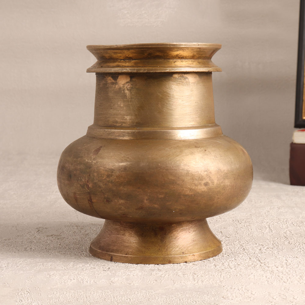 Adorn your spiritual space with the timeless elegance of the Vintage Brass Holy Water Pot which is affectionately known as the Sagar Pot. Meticulously handcrafted by skilled Indian artisans in the revered South Indian Art tradition, this pot is a masterpiece in antique brown finish brass. Its graceful design and intricate detailing transport you to an era where craftsmanship was an art form. Traditionally used during prayer to hold holy water, the Sagar Pot is a symbol of sanctity and reverence. Its versatile spout allows for precise pouring, adding a touch of ritual to your sacred moments. Beyond its spiritual significance, this pot serves as a stunning vessel for flower decoration, exuding an aura of sophistication. Made from high-quality brass, the pot promises durability and a rich, authentic aesthetic. Whether adorning your home, office, restaurant, hotel, or cafe, this piece seamlessly integrates into any space, turning it into a haven of serenity. A thoughtful addition to any vintage collection, it makes for an exquisite and meaningful gift for loved ones on special, festive, or auspicious occasions.
