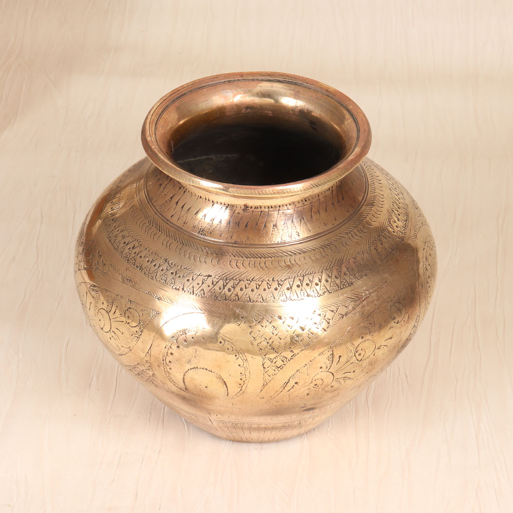 Infuse your daily rituals with the timeless beauty and spiritual energy of this vintage brass holy water pot. Meticulously crafted by artisans in the renowned Gujarat region, this piece features intricate carvings that echo the ornate designs found in ancient Indian temples. The solid brass construction ensures durability and a lustrous shine that will only deepen with age, making this holy water pot a cherished heirloom to be passed down through the generations. Whether you're looking to elevate your personal meditation practice or seeking a stunning centerpiece for your home altar, this holy water pot is a must-have for the spiritually-inclined. Fill it with blessed water and use it to purify your sacred space, anoint your forehead, or simply admire its timeless elegance as you center yourself in the divine. Upgrade your rituals and transform your environment with the grounding, uplifting presence of this exquisite brass vessel.
