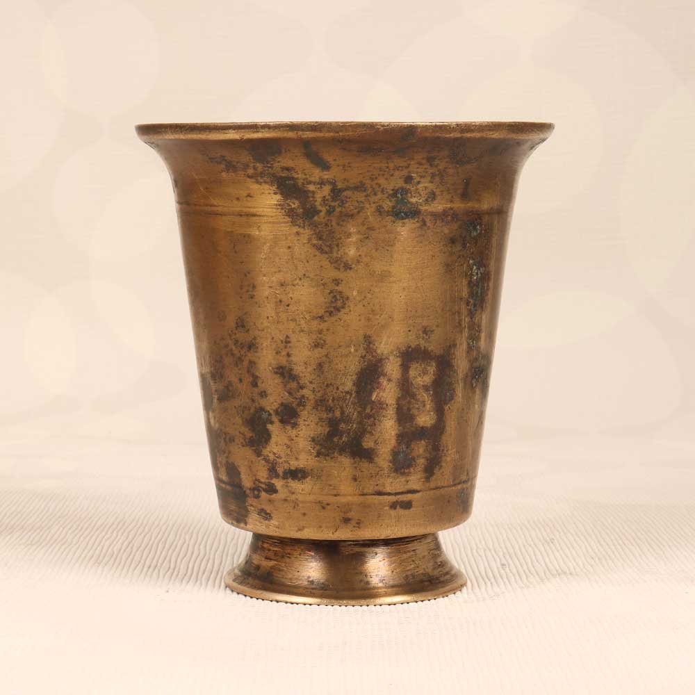 Transport yourself to a place of serenity with this exquisite brass holy water cup. This vintage-inspired piece brings a touch of spirituality to any space. Lovingly handcrafted from brass in a classic South Indian Art style, it features intricate engraved details for a one-of-a-kind look. Feel the calming effects wash over you whenever you gaze upon this cup's intricate beauty. Let it remind you to take a moment to breathe, reflect, and connect to the divine. For those seeking an inspired way to incorporate spiritual symbols into their home decor, this brass cup makes a meaningful addition. Transport your mind, body and soul with just one glance at this special cup. With its vintage design and sacred symbolism, you’ll feel peaceful, grounded, and more connected to your spiritual side every time you look at it.