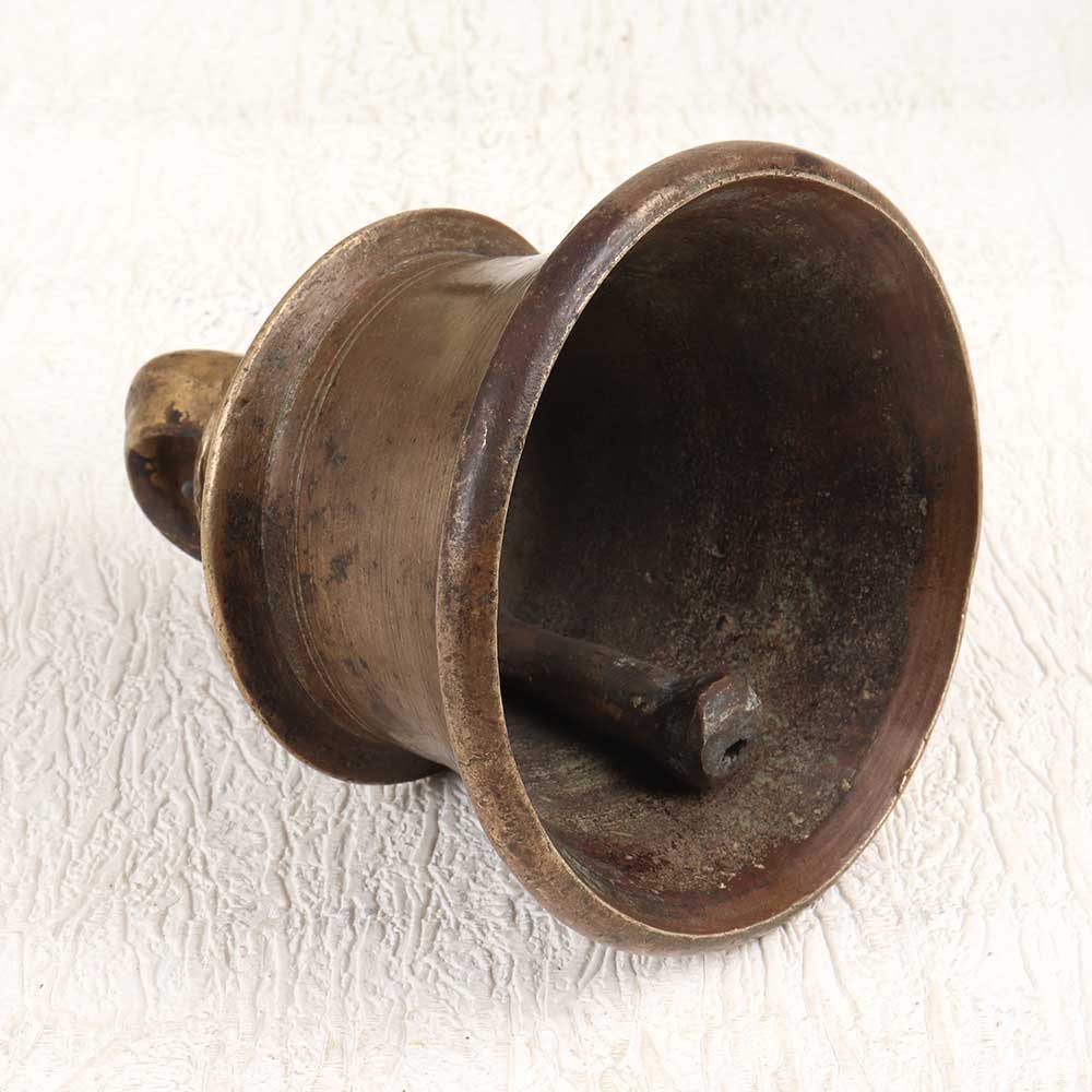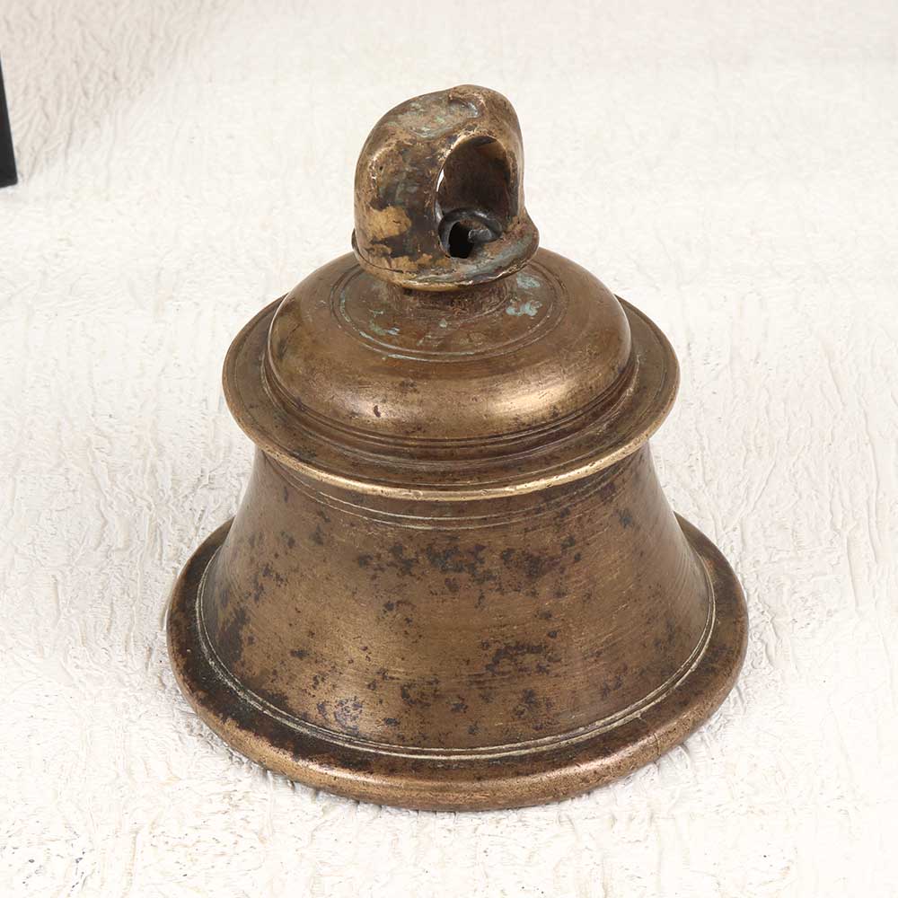 Let the soothing tones of this vintage bell metal temple bell fill your home with peace. This beautiful handcrafted bell is an elegant way to create a spiritual ambiance. Allow the gentle tones of this bell to calm your mind and uplift your spirit. The vintage patina finish gives this bell a timeless, earthy look that adds warmth to any room. Hang it by a doorway or window and let the breeze create random chimes throughout the day. The minimalist design highlights the beautiful tone. Bring a sense of serenity and ritual to your daily life with this special bell. Use it to call family to dinner, start and end meditation sessions, or create a peaceful retreat. The vintage temple bell infuses traditional Indian craftsmanship into your home.