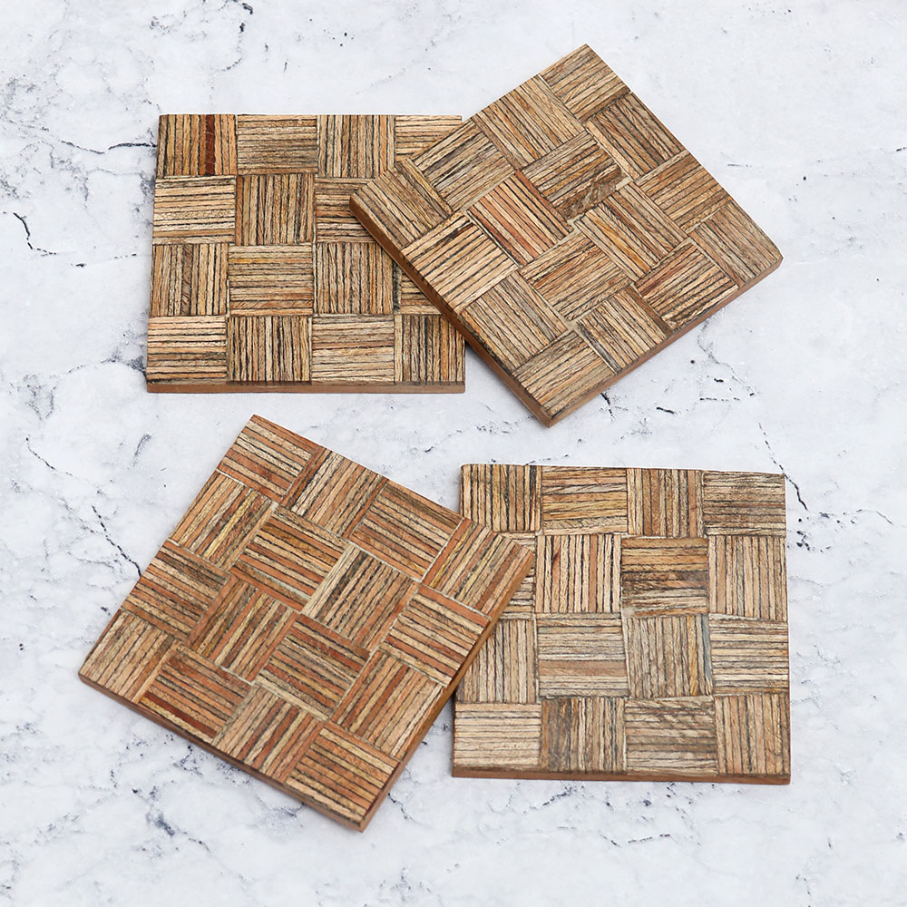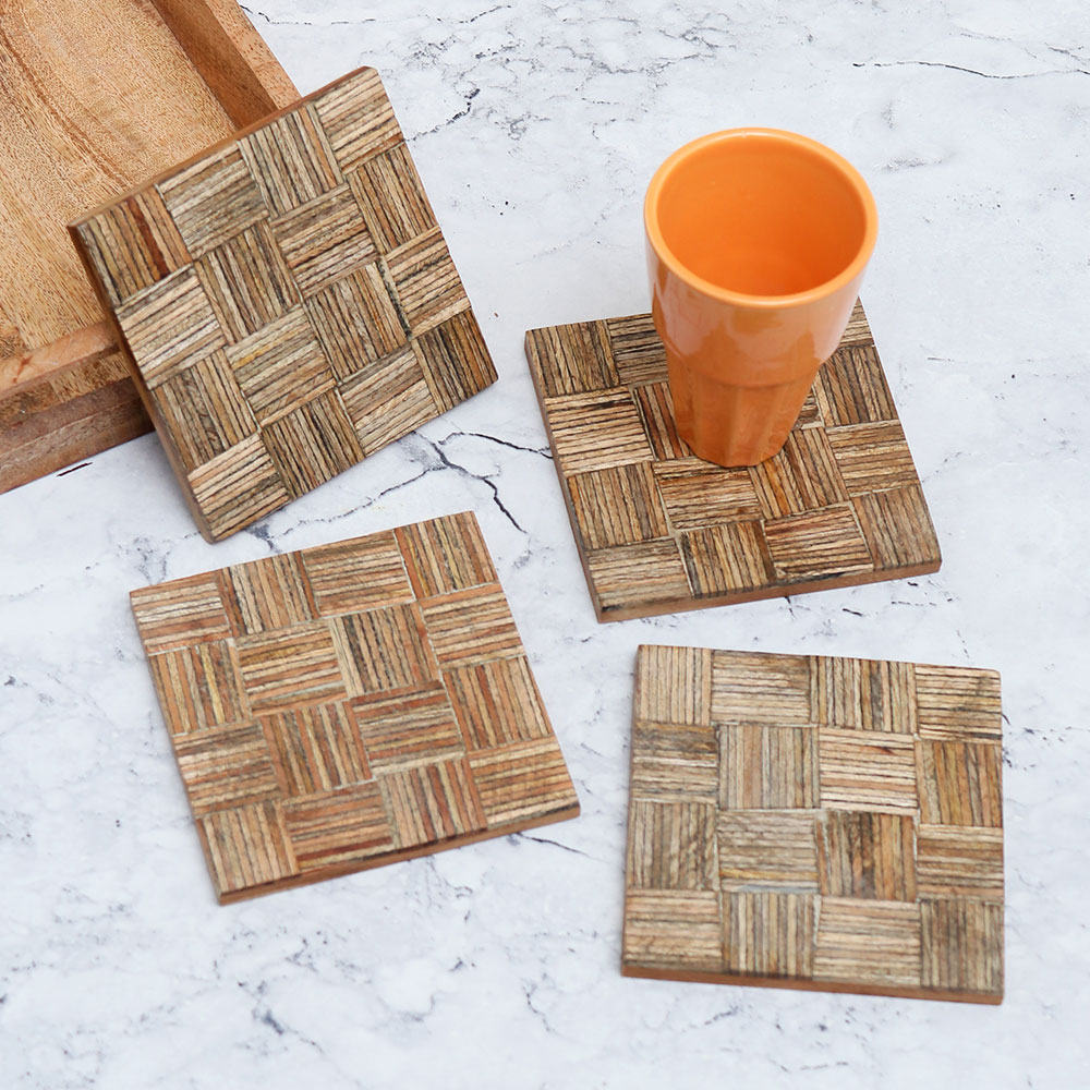 This beautiful Pack of four wooden coasters is meticulously handcrafted by masterful Indian artisans. These coasters are made from the finest quality wood, ensuring their durability and longevity. With a charming square shape, they effortlessly blend functionality with aesthetics. Each coaster features an elegant brown check pattern that adds a touch of sophistication to any setting. The artisans have skillfully applied an antique finish, enhancing their vintage appeal. Beyond their practicality, these coasters serve as delightful decorative pieces for your home or office, seamlessly elevating the ambiance. Designed to protect your surfaces, these coasters are ideal for holding water, tea, juice, or coffee glasses. Whether you are relaxing at home, working in the office, dining at a restaurant, staying at a hotel, or enjoying a cup of coffee in a cafe, these coasters prevent unsightly stains, maintaining the pristine condition of your furniture. Furthermore, these coasters make for a thoughtful gift for your loved fours on special or festive occasions.