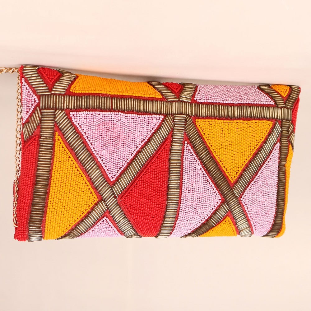 Infuse your ensemble with radiant energy through this striking mosaic-style clutch. Featuring a vibrant pattern of triangular beadwork stitched with geometric precision, this handcrafted piece is a celebration of color and bold artistry. The fold-over envelope design offers timeless appeal, while the addition of a detachable chain strap allows for versatile styling—carry it as a clutch or wear it crossbody for effortless flair.