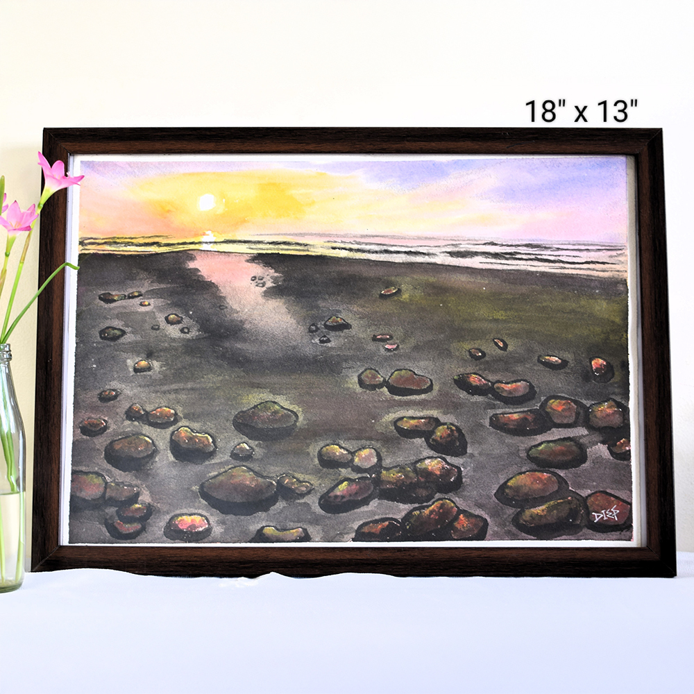 This tranquil watercolor painting captures the serene beauty of a rocky beach during sunset. With warm hues reflecting on the wet sand and gentle waves lining the horizon, the composition evokes a quiet, meditative moment by the sea. Hand-painted on paper by Artist Dimpana, this piece blends realism with soft atmospheric tones to celebrate nature's peaceful rhythms.