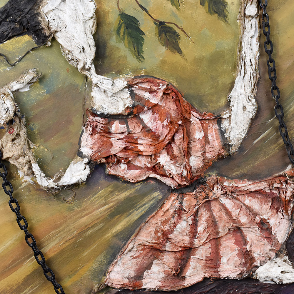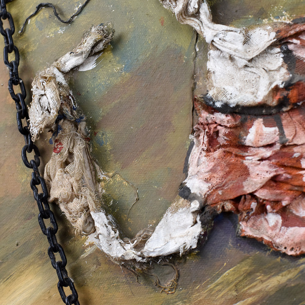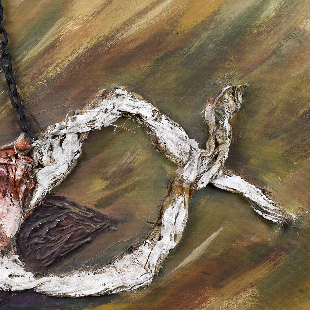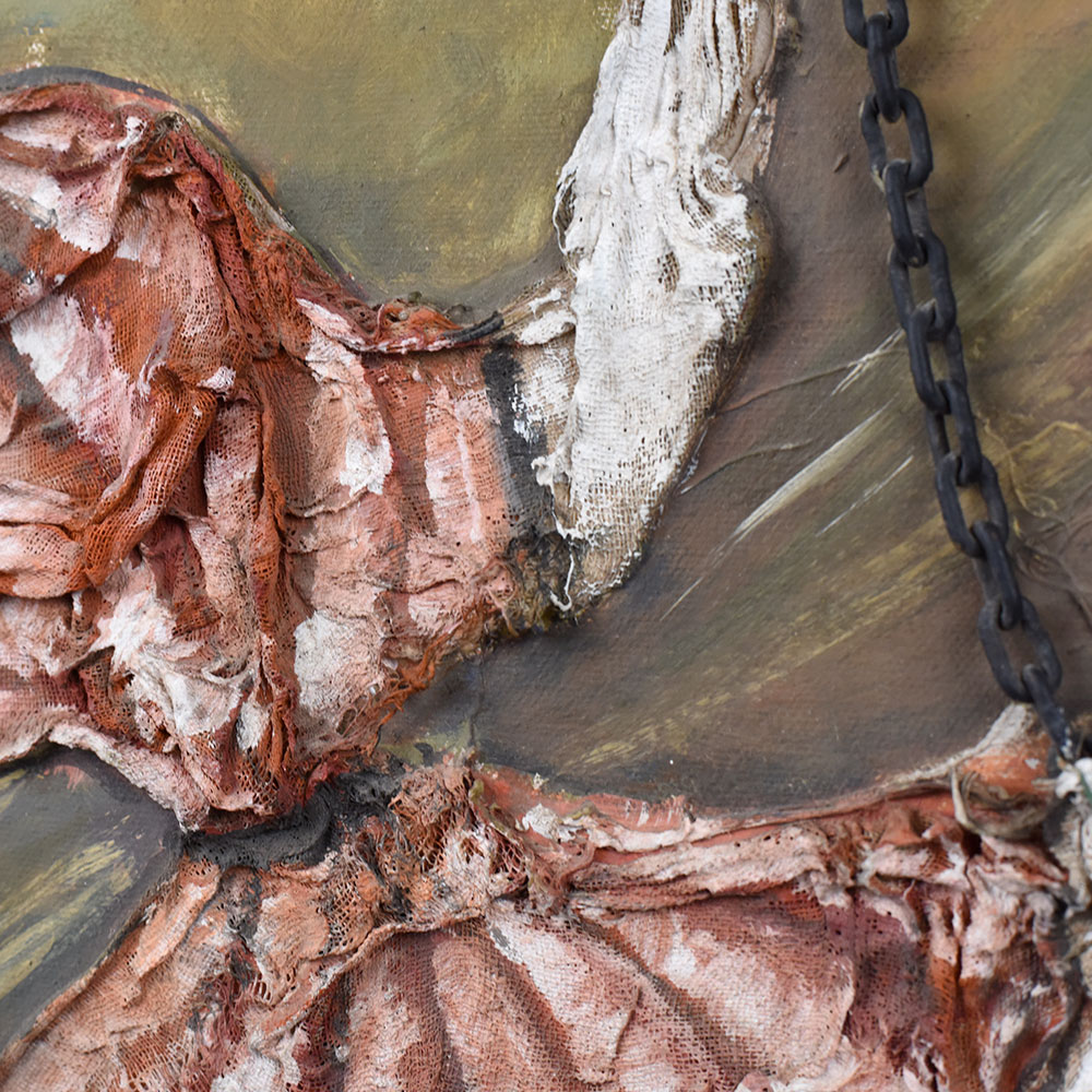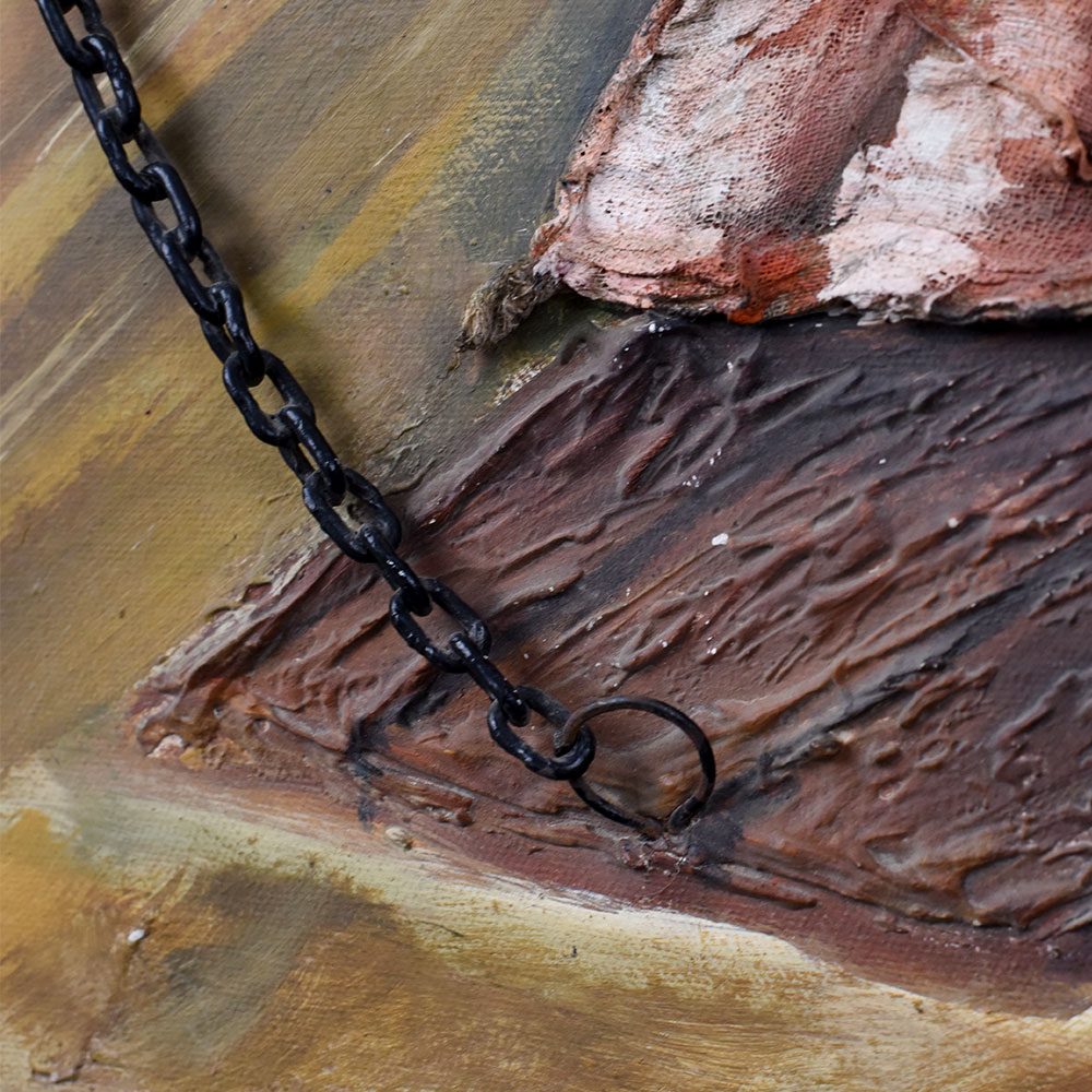 - Mixed Media Texture: Combines paint and sculpted relief with real chains for a 3D effect.