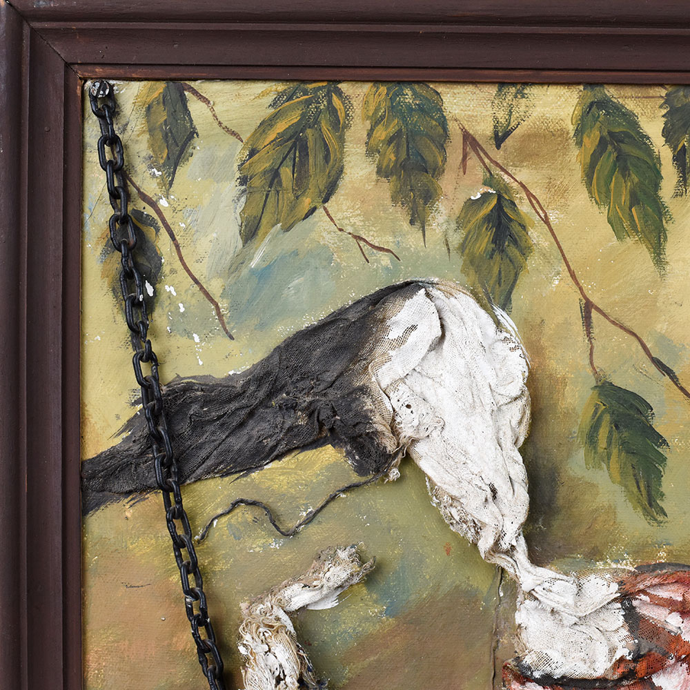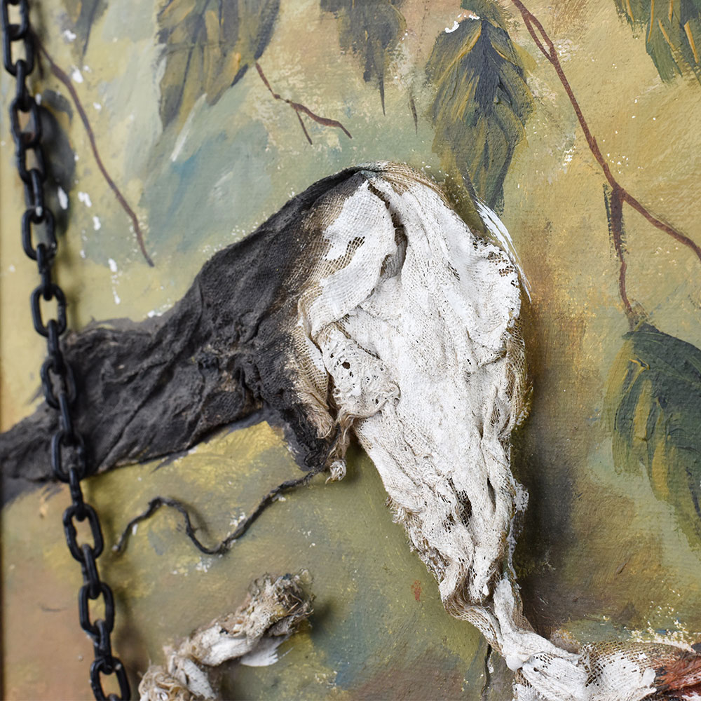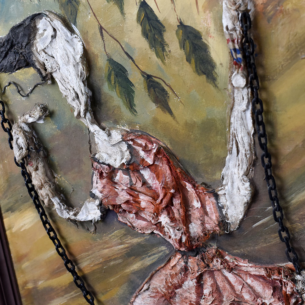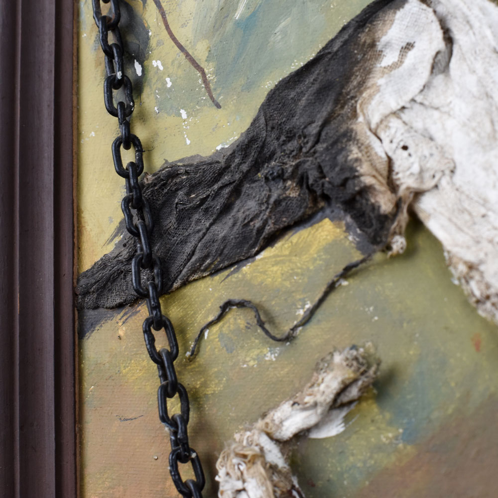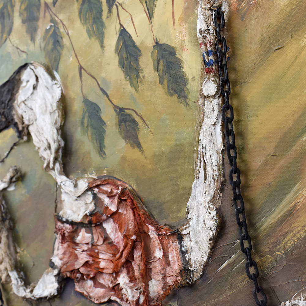 - Mixed Media Texture: Combines paint and sculpted relief with real chains for a 3D effect.