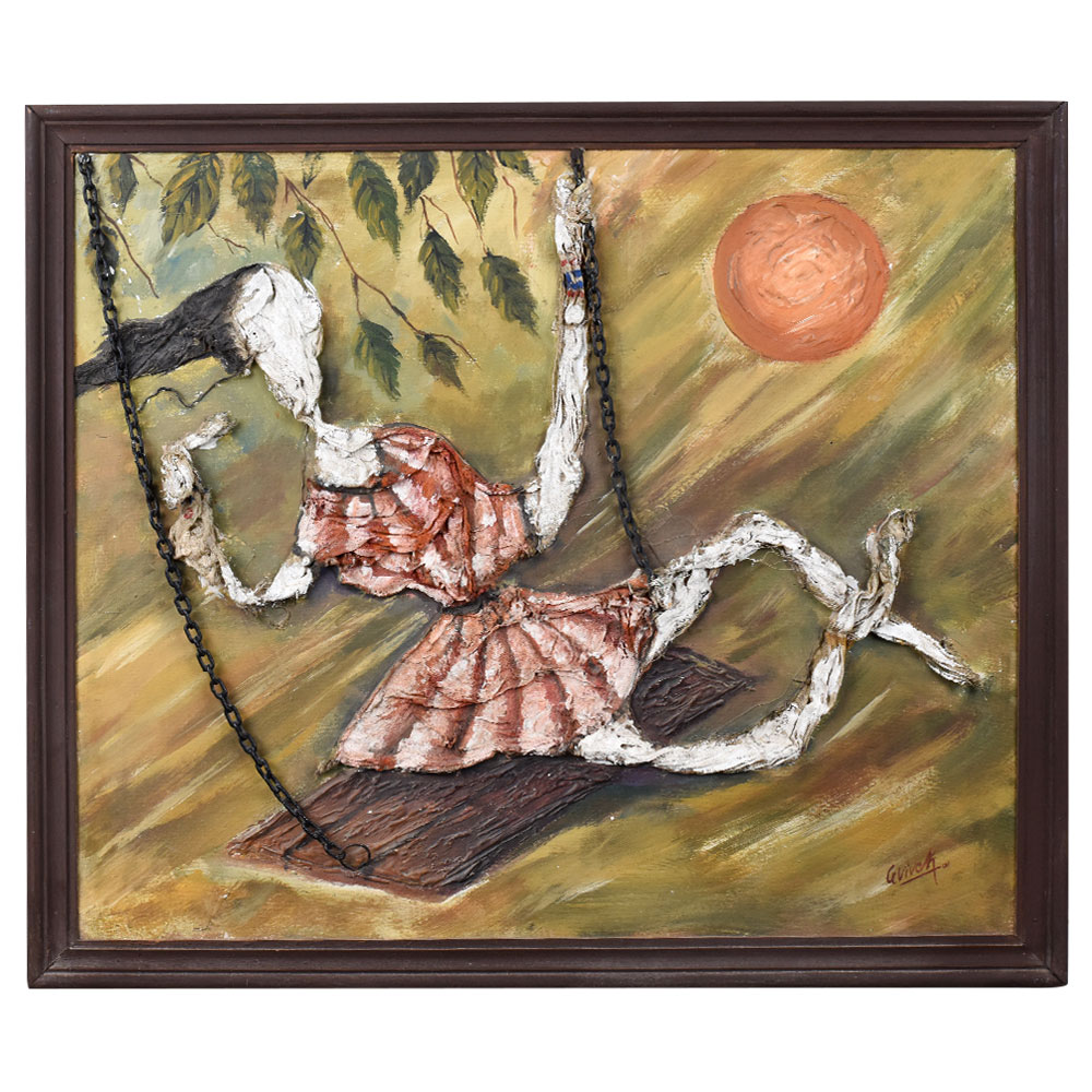 This unique canvas board painting blends textured relief and abstract form to depict a whimsical, almost surreal scene of a woman on a swing. Crafted with thick, sculptural strokes, the figure appears elongated and stylized, her limbs flowing like ribbons in motion. Dressed in a red skirt and blouse, she is captured mid-swing under leafy branches and a warm orange sun, evoking a sense of carefree joy and nostalgia. The background, awash in earthy greens and yellows with diagonal brushstrokes, enhances the dynamic feel of movement. Real metal chains are used for the swing, adding a tactile, mixed-media element to the piece.
