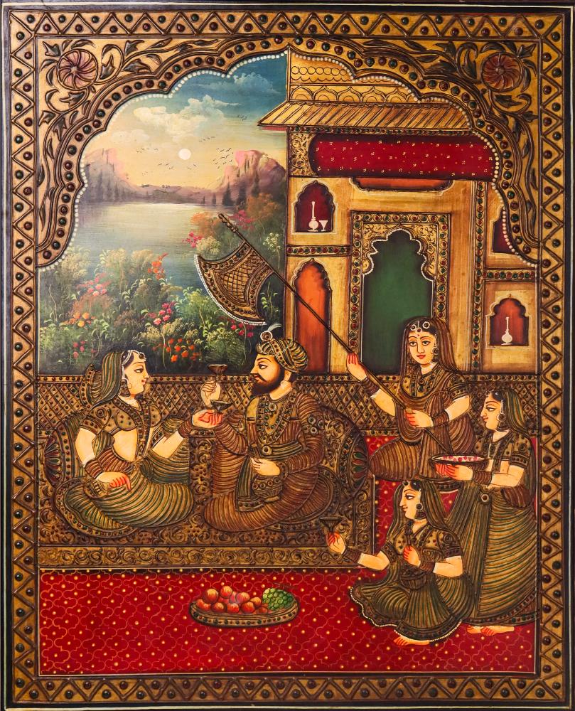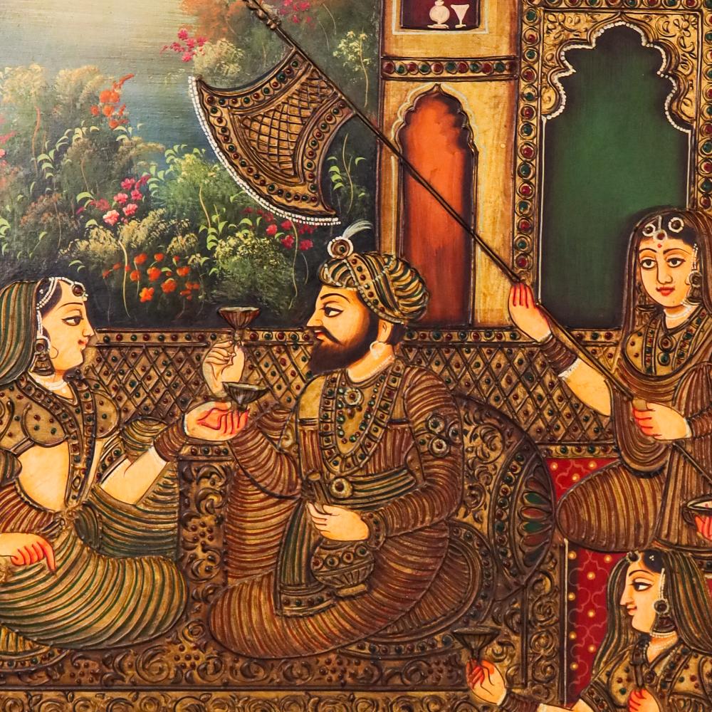 - Depicts a royal leisure scene with king, queen, and attendants.