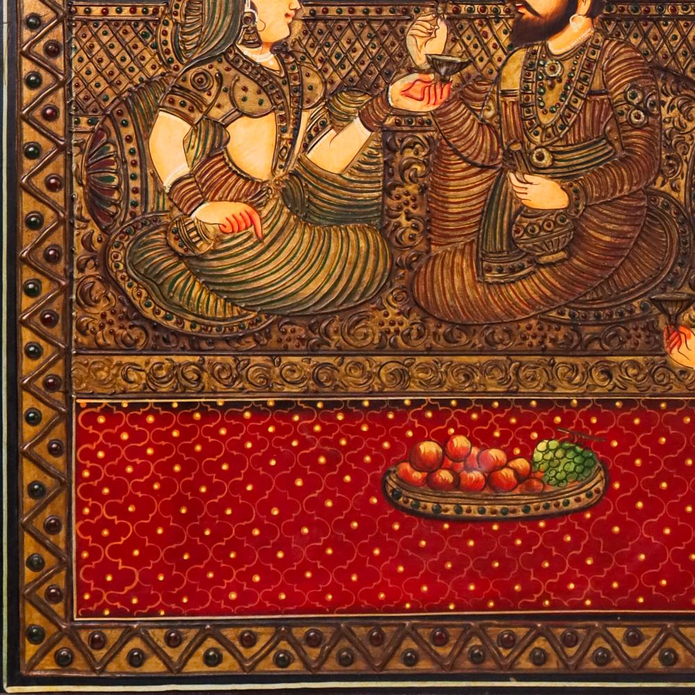 This magnificent Tanjore painting captures a royal durbar scene infused with grandeur, elegance, and intricate craftsmanship. Depicting a regal king and queen enjoying a serene moment amidst courtiers and attendants, the artwork exudes the opulence of a bygone era. Set against a richly detailed backdrop featuring a palace window opening into a lush, moonlit landscape, the piece perfectly blends nature and royalty. Crafted on board and finished with an antique look, the painting embodies the essence of Tanjore artistry—vibrant colors, ornamental detailing, and a divine-like grace. The figures are adorned in traditional South Indian attire, complete with ornate jewelry and expressive facial features. Every element, from the fruits arranged in a tray to the patterns on the carpet, speaks volumes of the artist’s dedication and attention to detail.