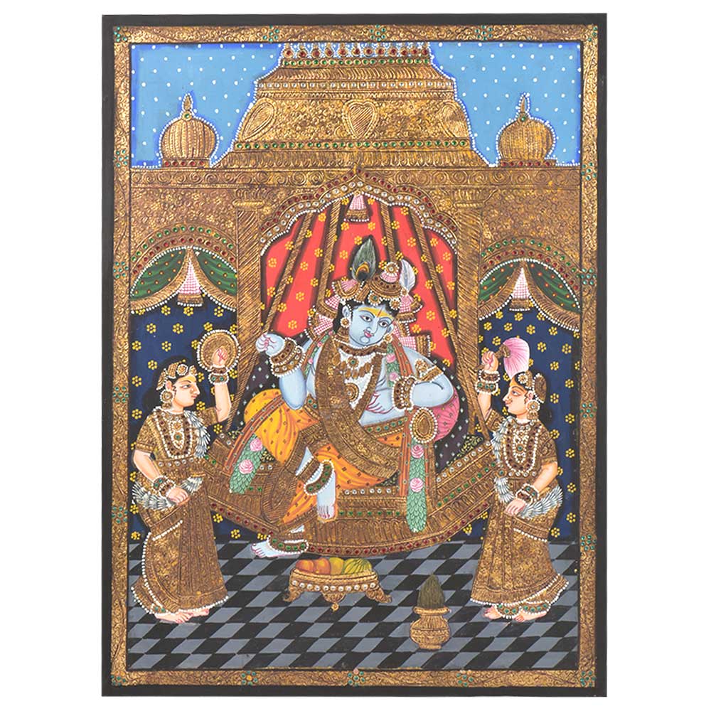 Tanjore Painting of Krishna With Bama and Rukmani With Frame