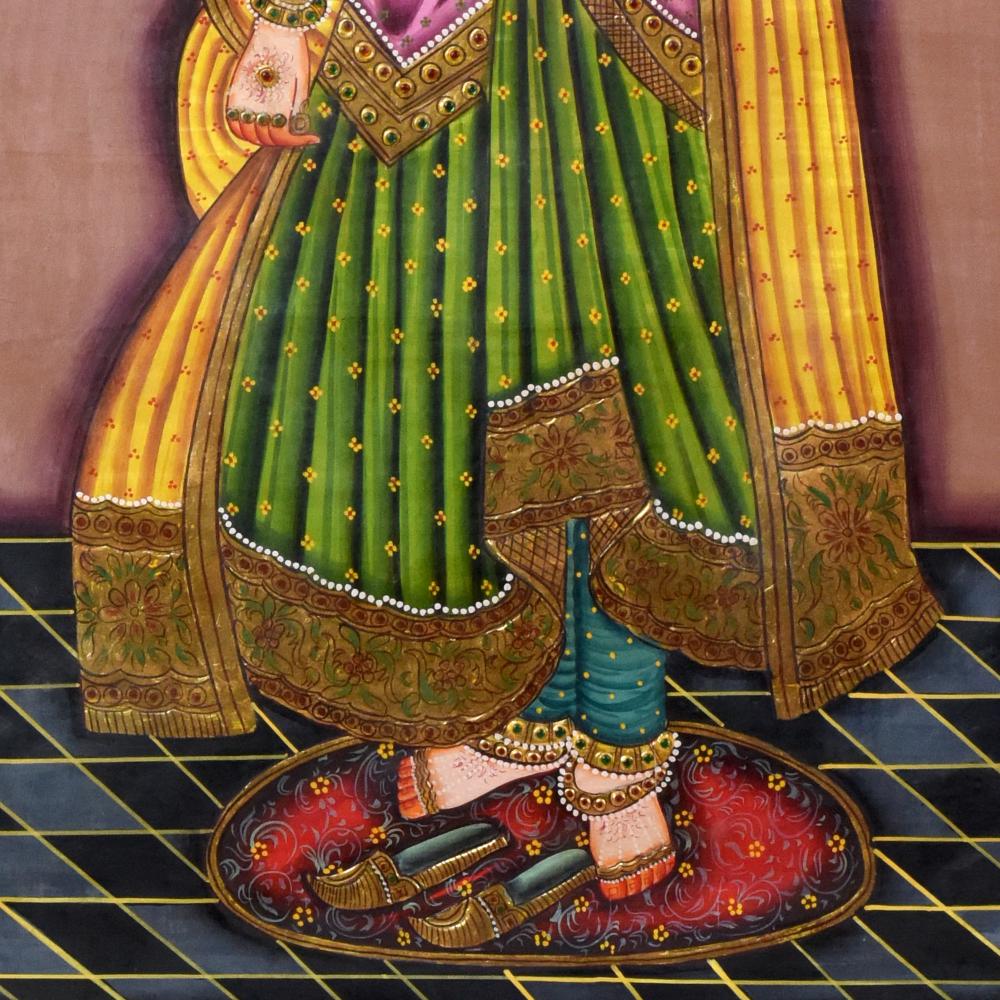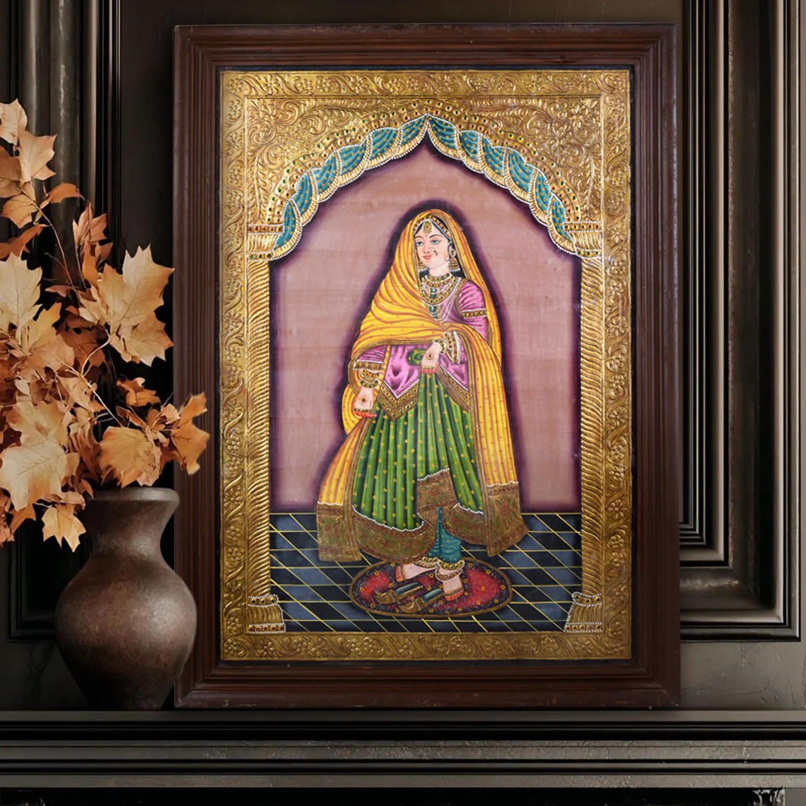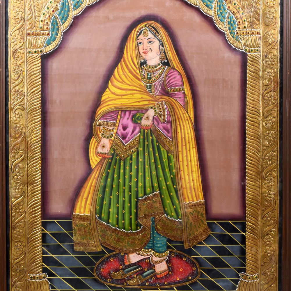 Prepare to be captivated by the timeless elegance of this exquisite Tanjore painting depicting a lady. Meticulously crafted by skilled artisans, this piece is a testament to the rich cultural heritage of South India, radiating a mesmerizing beauty that will transform any room into a sanctuary of refined sophistication. This Tanjore painting is more than just a work of art - it's a portal to a bygone era, where the elegance of the past meets the refined sensibilities of the present. Adorning your home with this captivating depiction of a lady will elevate your space, imbuing it with a sense of timeless beauty and cultural richness that will captivate all who behold it. Whether you're a seasoned art collector or simply seeking to add a touch of refined elegance to your decor, this Tanjore painting is a must-have. Immerse yourself in the timeless allure of this stunning piece and let it transport you to a world of unparalleled beauty and refinement.