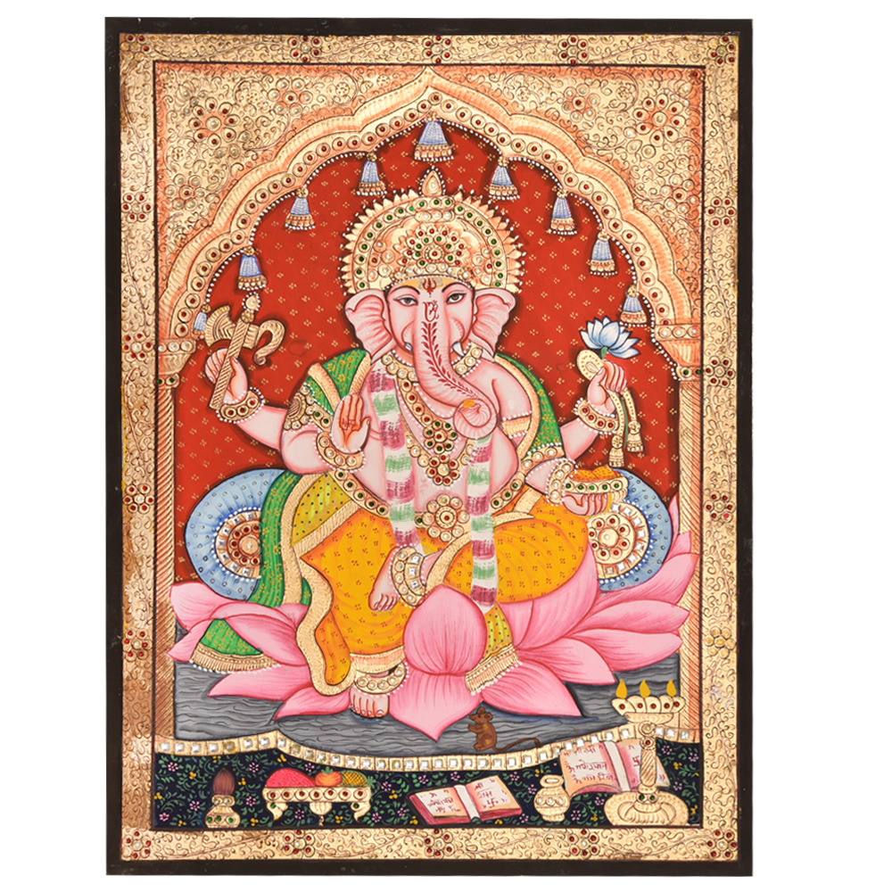 Tanjore painting of Lord Ganesha made from original 24 carat gold leaves and 100% authentic Jaipur gems. Made on board.