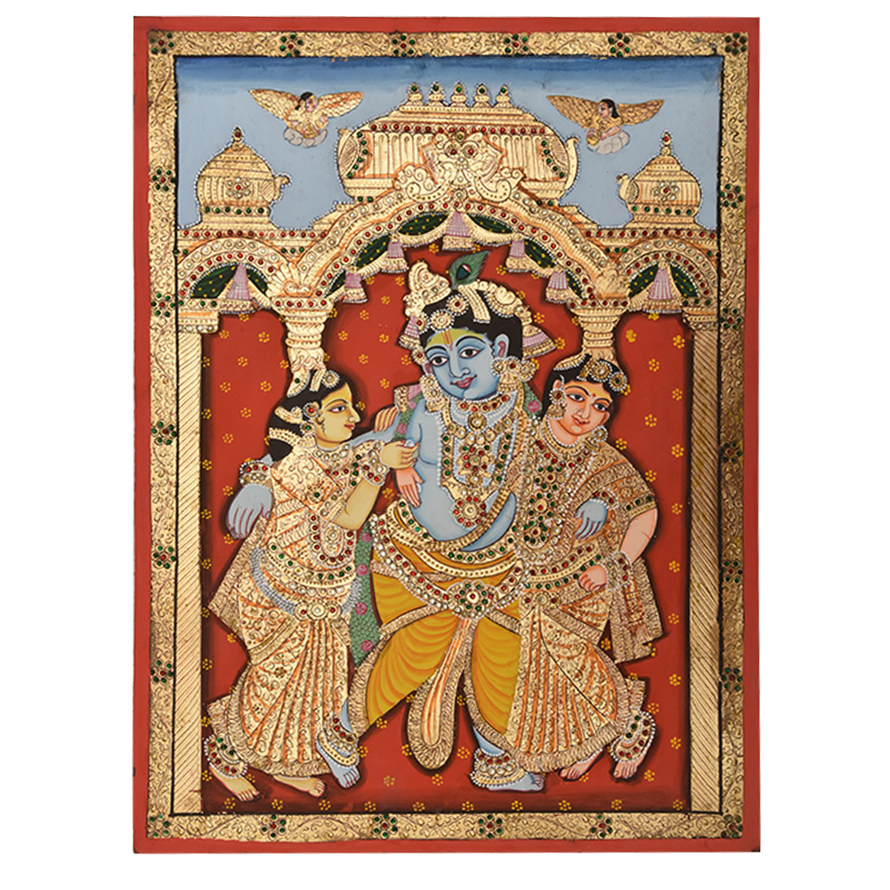 Tanjore painting of Lord Krishna along with Rukmani and Bama