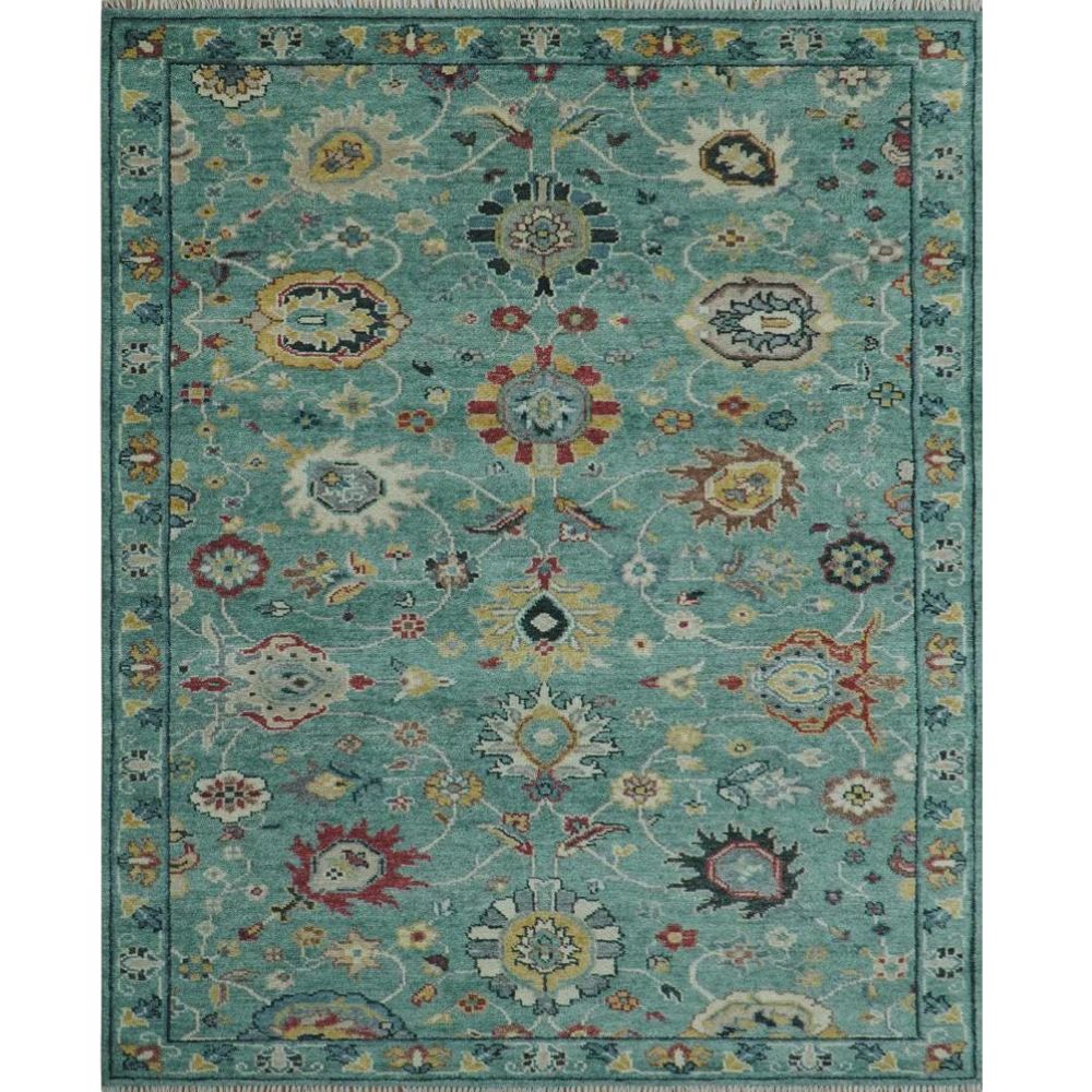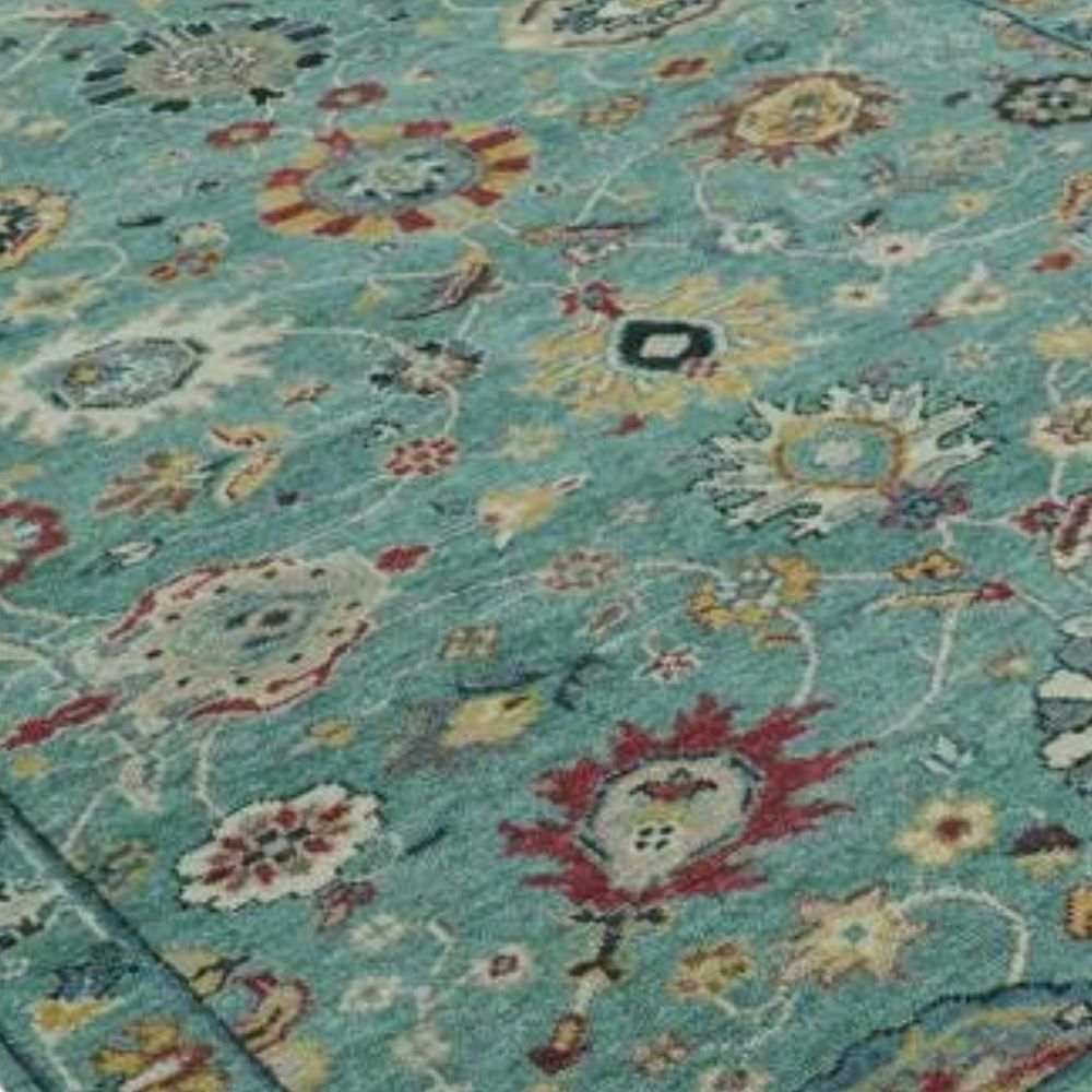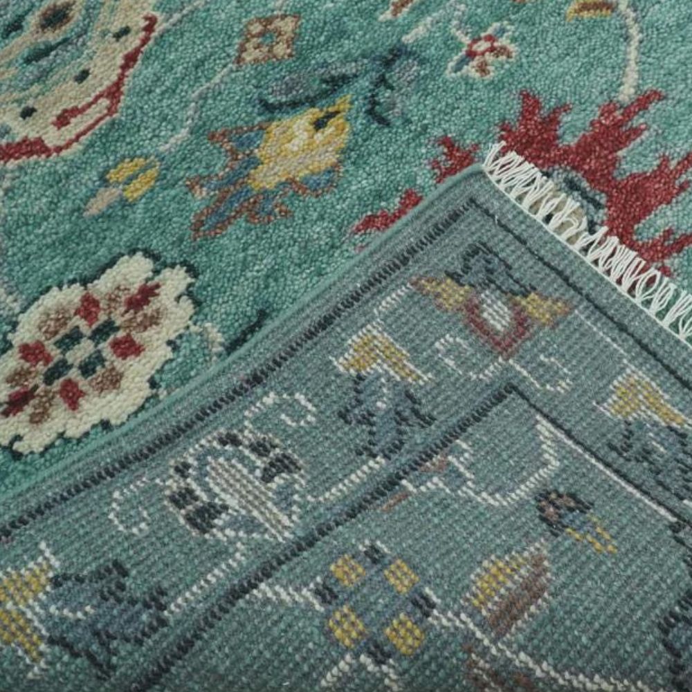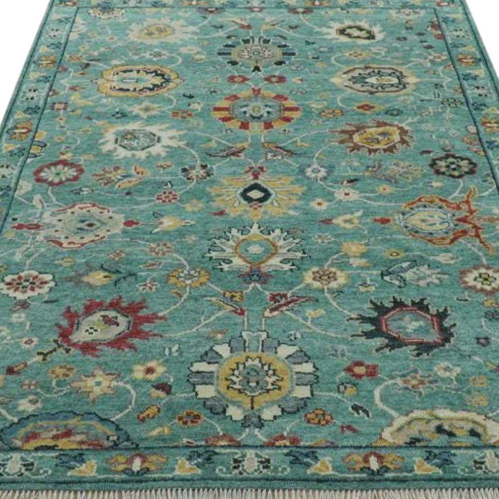 The Oushak-inspired motifs reflect heritage weaving while the teal base adds a refreshing modern touch.