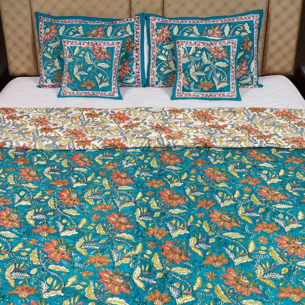 This teal multicolor Malmal (Voile) quilt radiates sophistication with its lush floral hand-block prints and earthy undertones. Made from soft cotton voile, it combines the lightness of traditional Indian fabric with modern elegance. Expertly handmade and quality-checked by Indianshelf to ensure unmatched craftsmanship and authenticity.