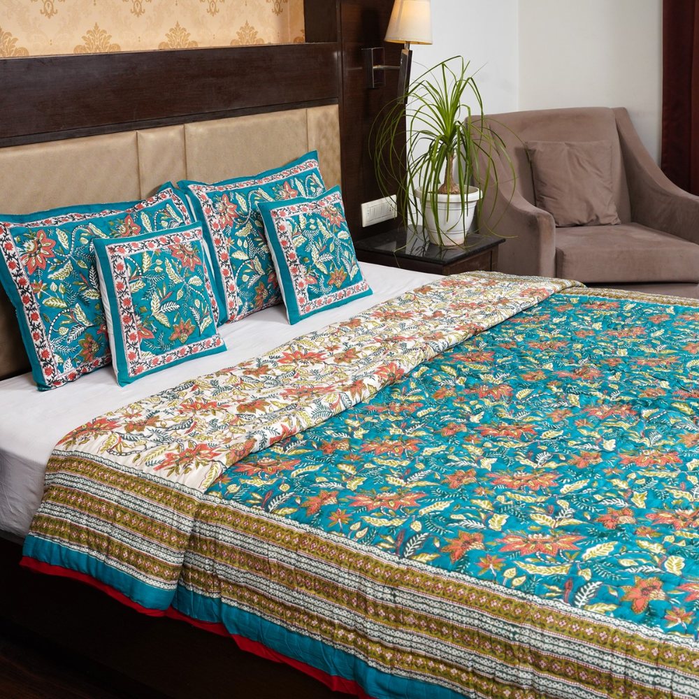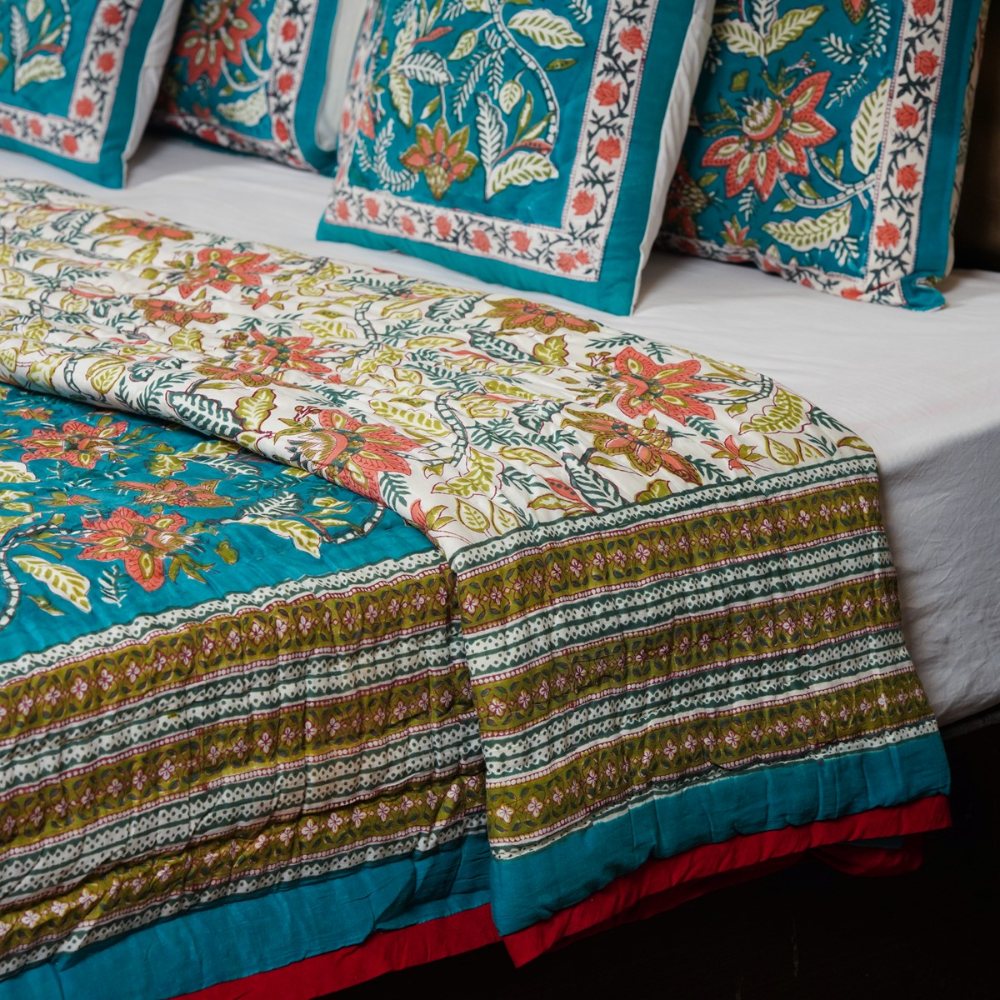 This quilt celebrates India’s centuries-old hand-block printing artistry. Every piece is handmade — never machine-made — supporting skilled artisans and sustainable craft traditions.