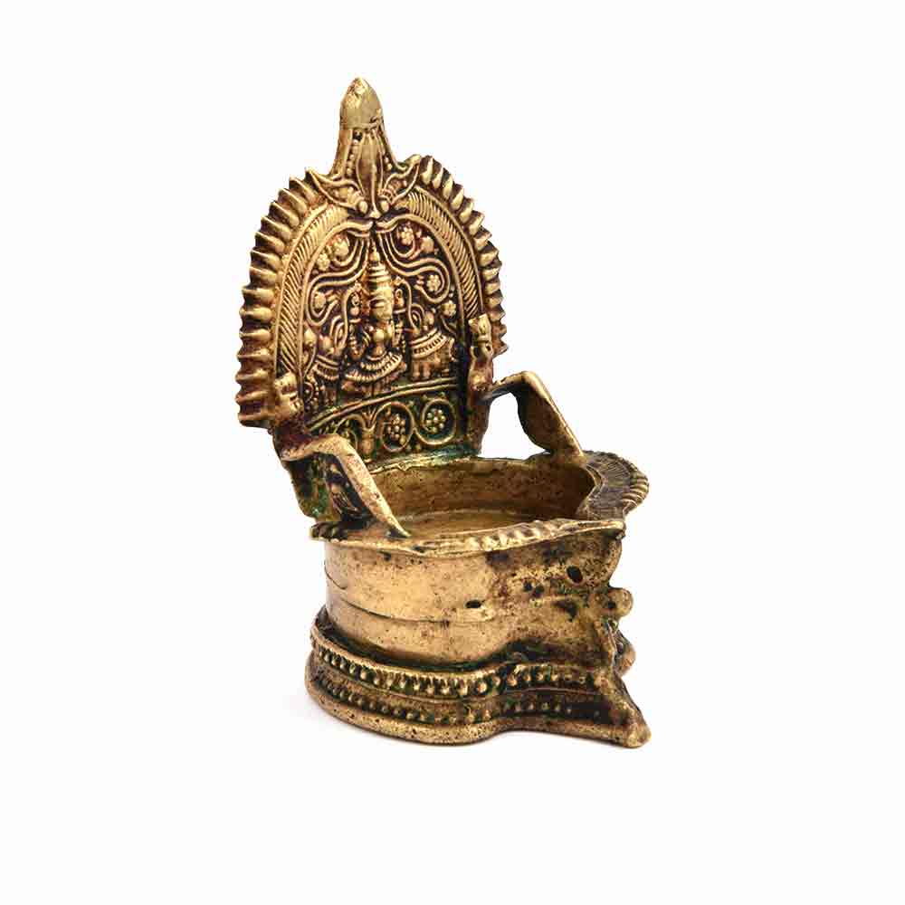 Temple bronze oil lamp with laxmi, kalash and flowers on both the side. It is made by lost wax process. Adds spiritual flavour to your decor. Vegetable oil, mustard oil or desi ghee can be used to light the lamp with cotton wicks.