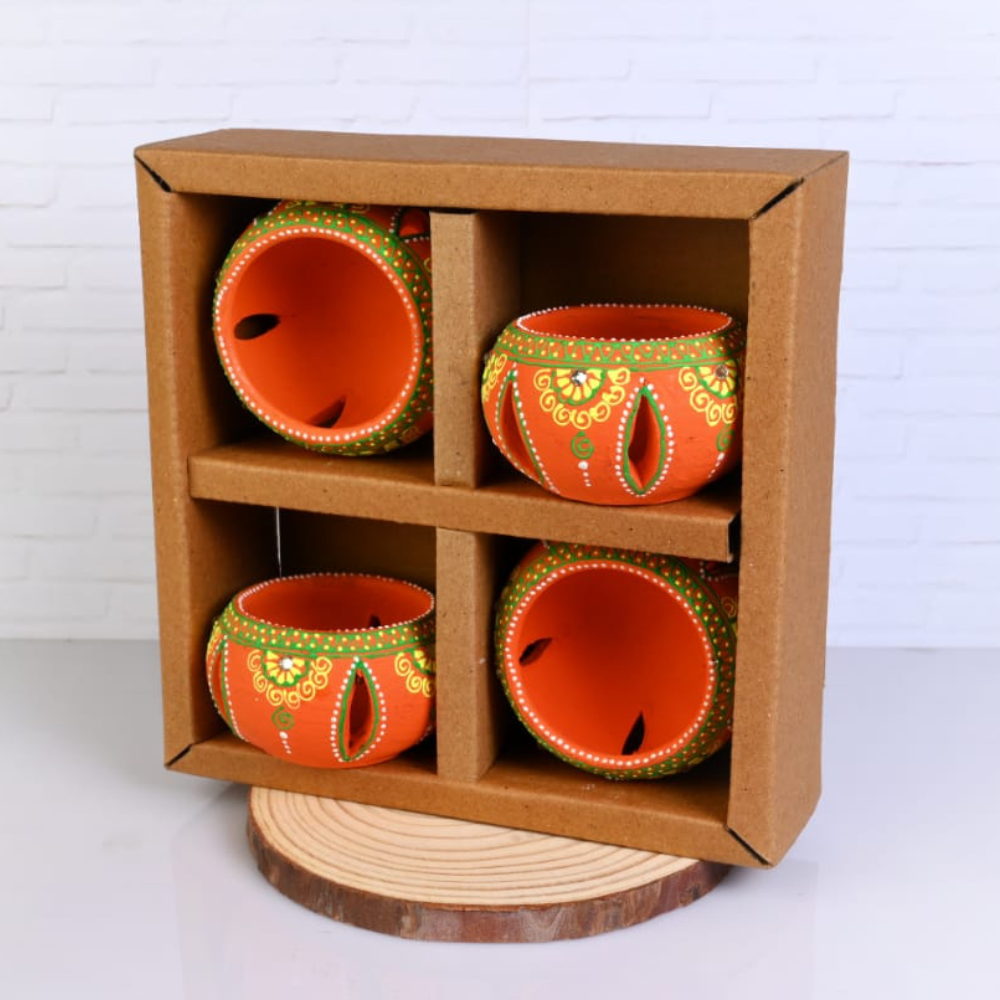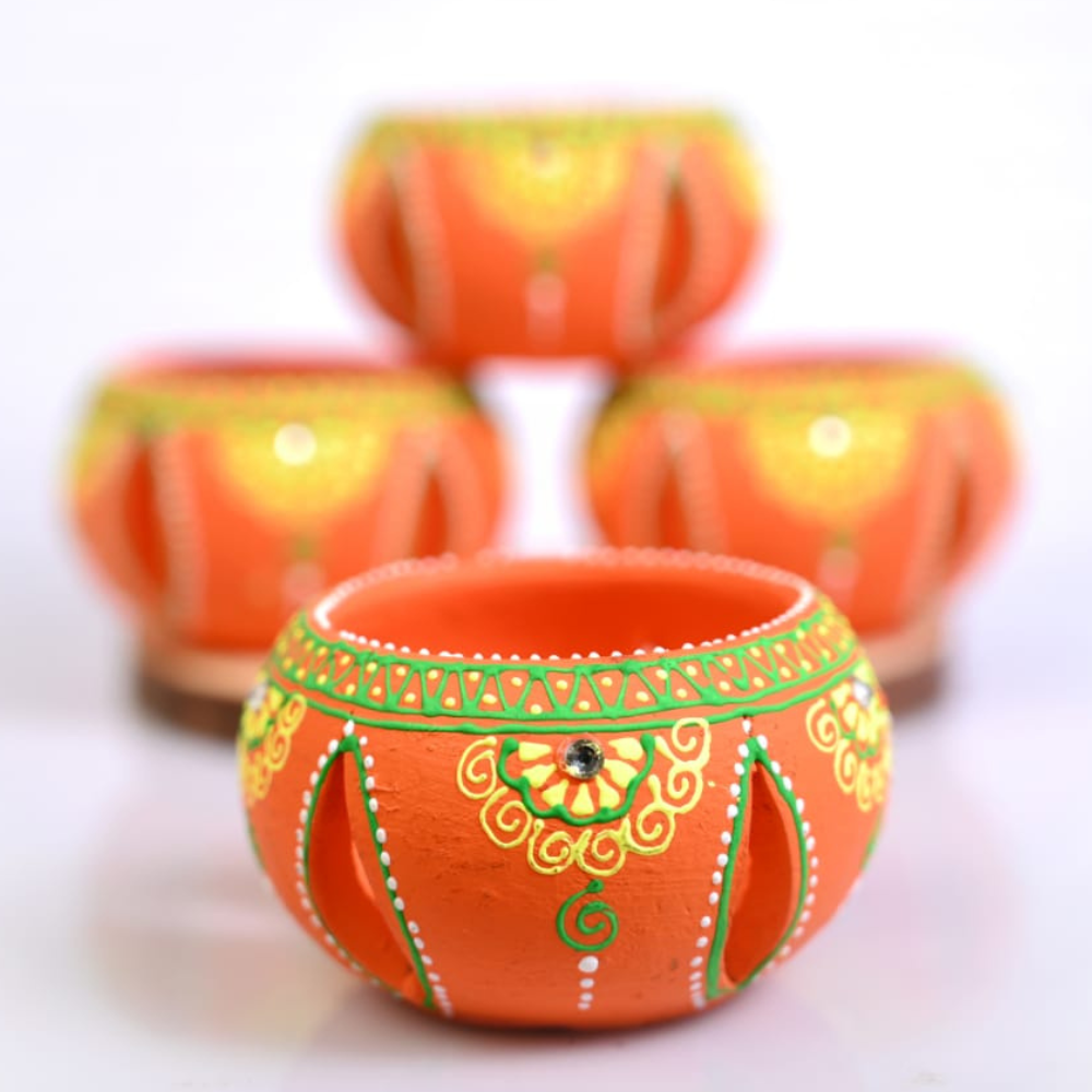 Enhance your festive décor with the Handmade Terracotta Jali Round Diya in Orange, a stunning fusion of tradition and artistry. Its intricate jali cutwork design allows the warm glow of a flame or tealight to filter through beautifully, casting delicate patterns of light. With its bright orange finish, this diya becomes both a spiritual and decorative accent for your home.