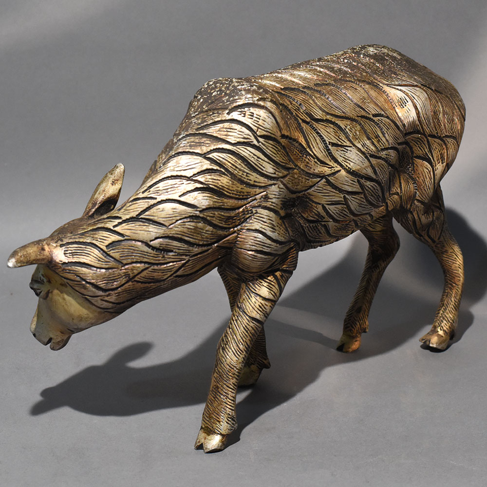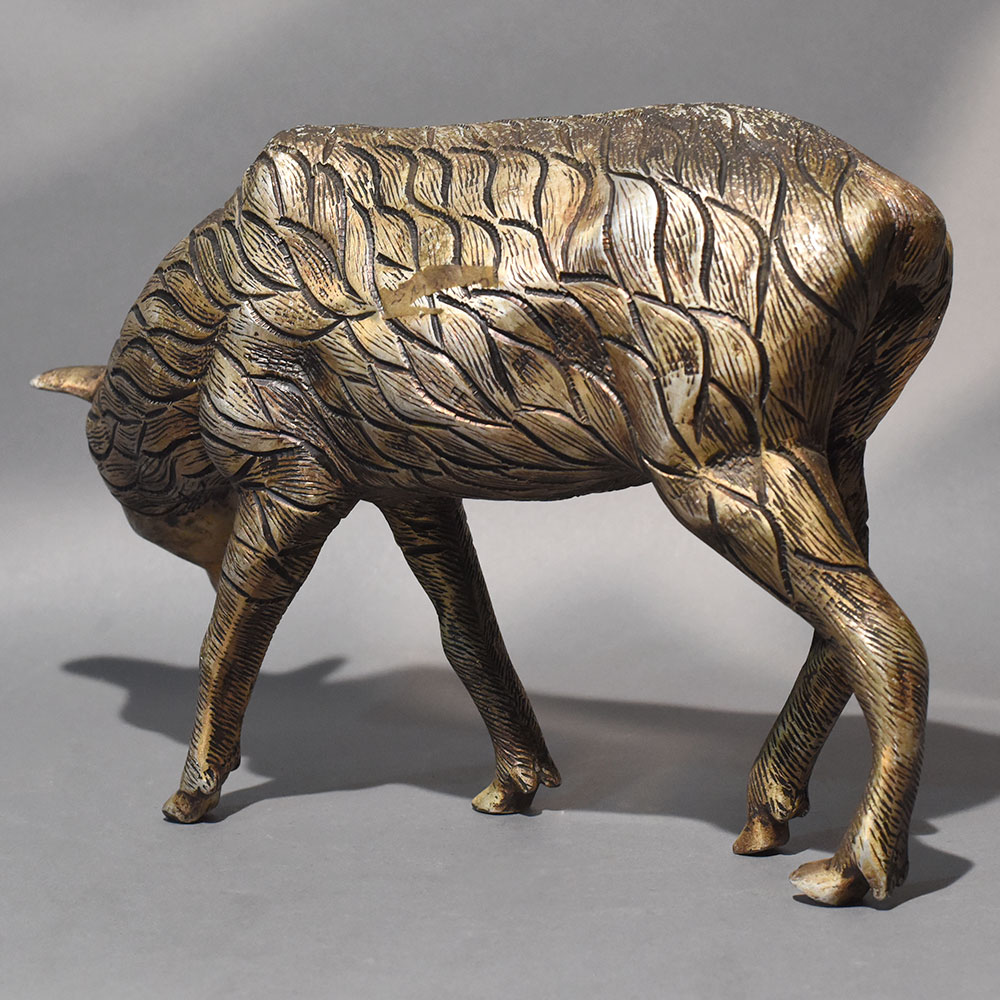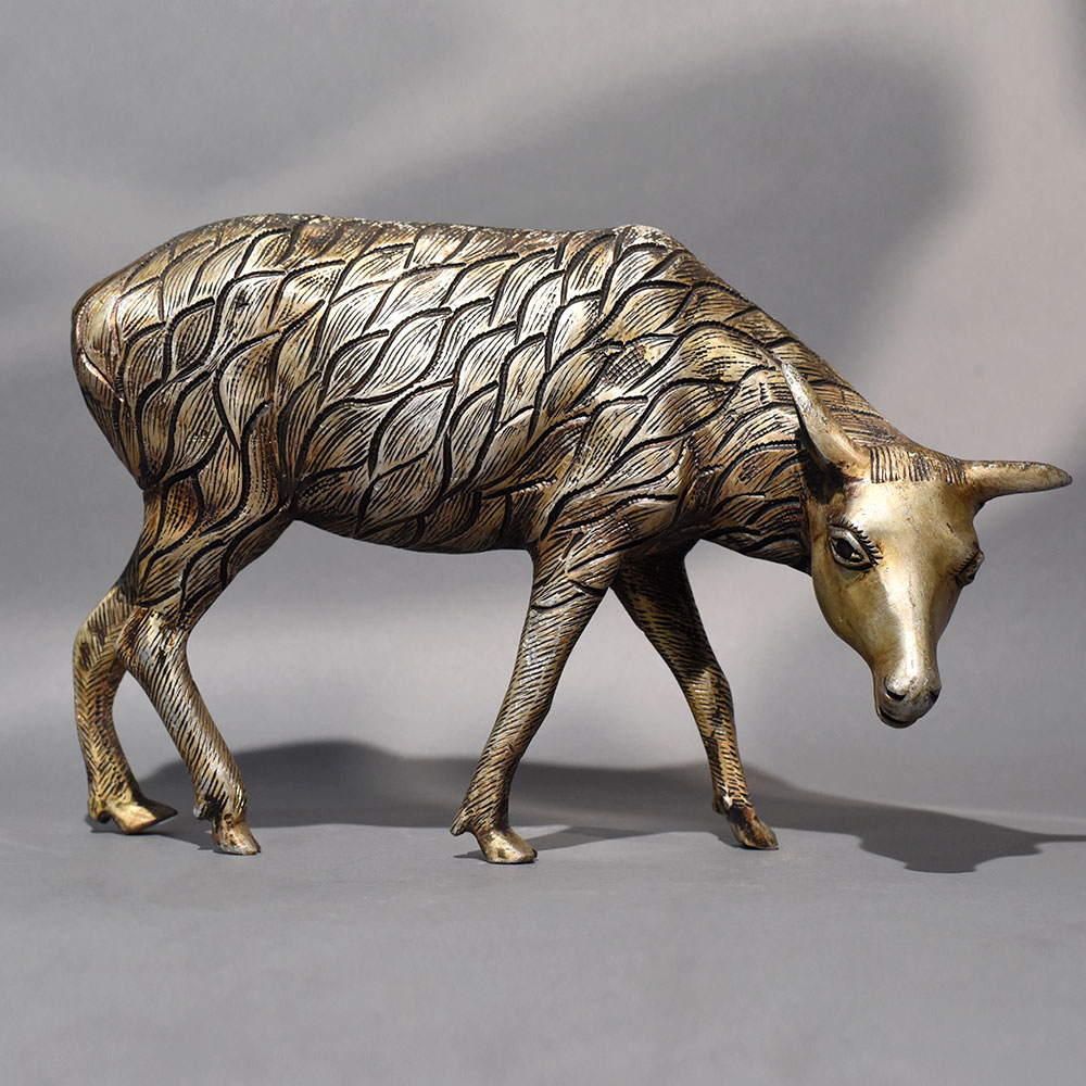 This textured brass grazing cow handcrafted sculpture captures the quiet elegance of a pastoral moment through intricate metal artistry. Designed in a lowered-head posture as if gently grazing, the figure conveys calm movement and grounded presence. The flowing engraved patterns across the body resemble layered foliage or feather-like textures, adding remarkable visual depth and character. The sculptures face is smoothly contoured with softly defined eyes and delicate horn detailing, creating a refined contrast against the richly patterned torso. The antique brass finish features natural tonal shading that enhances the carved textures and highlights the organic lines of the form. The balanced leg positioning ensures stability while maintaining a realistic stance. Crafted using traditional casting methods, this handcrafted brass cow sculpture reflects both artistic precision and cultural symbolism. The cow is widely regarded as a symbol of nourishment, peace, and abundance. In Decor styling, it introduces warmth and serenity, making it suitable for living rooms, office shelves, meditation corners, or heritage-inspired interiors. Its elongated design allows it to stand gracefully on console tables, cabinets, or display units. The solid brass material ensures durability and long-lasting finish retention, while subtle variations in tone affirm its handmade authenticity.