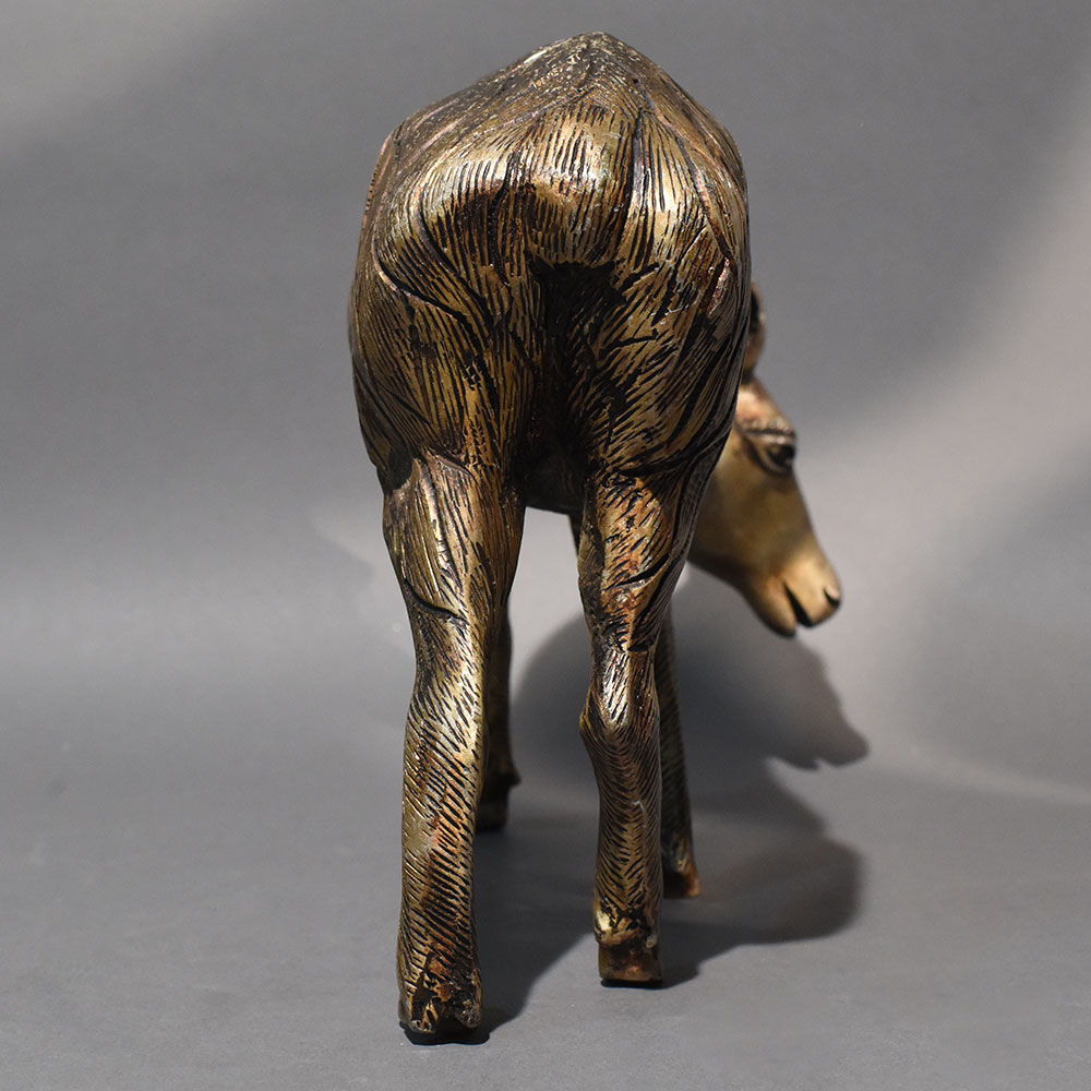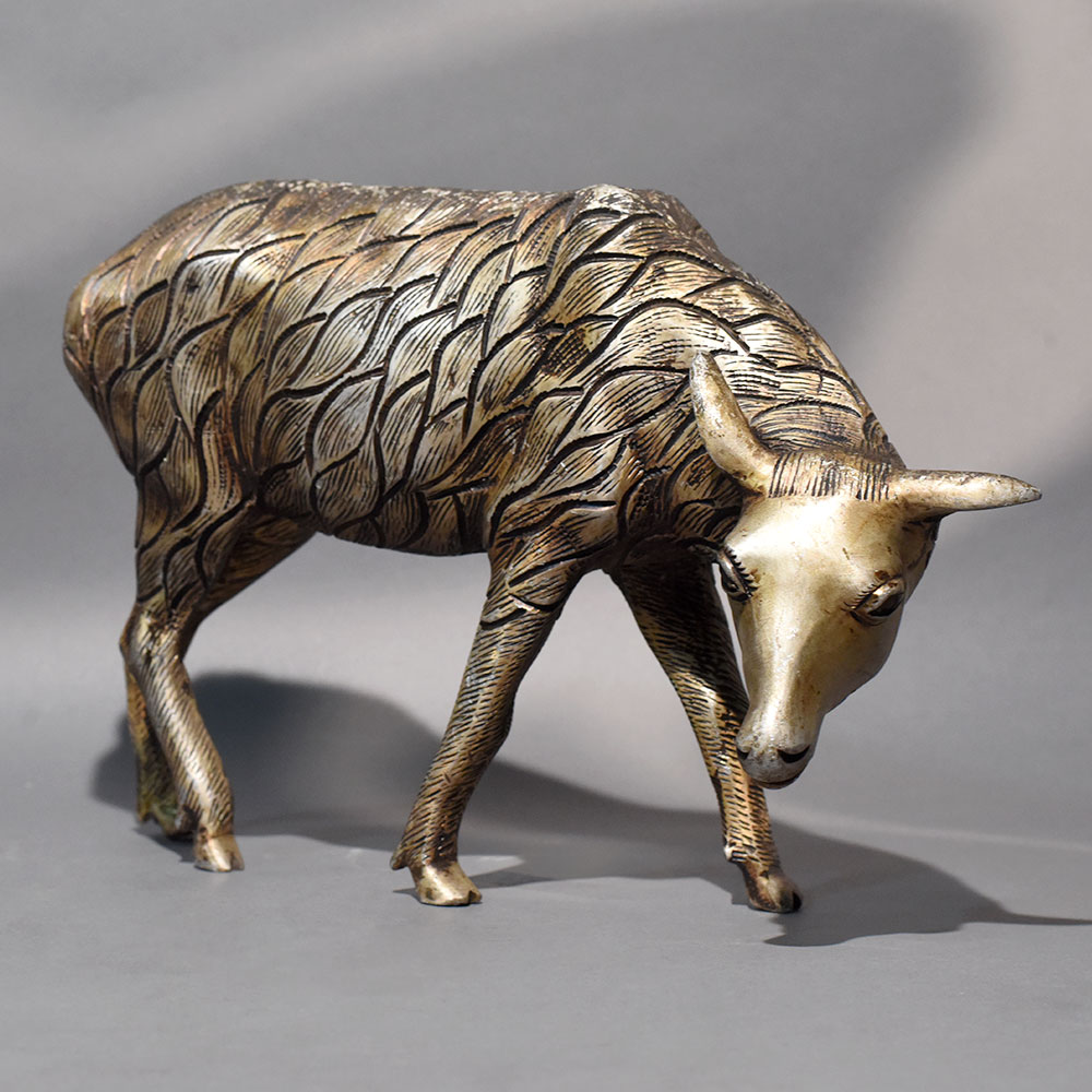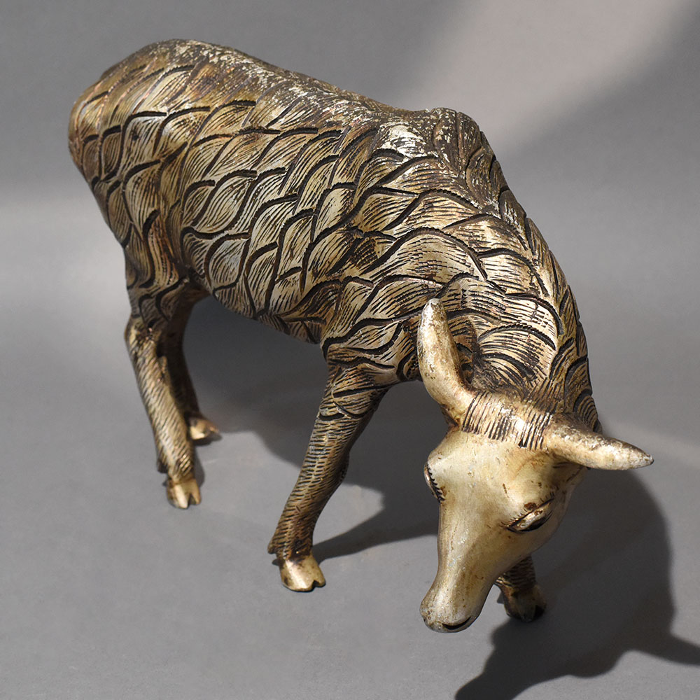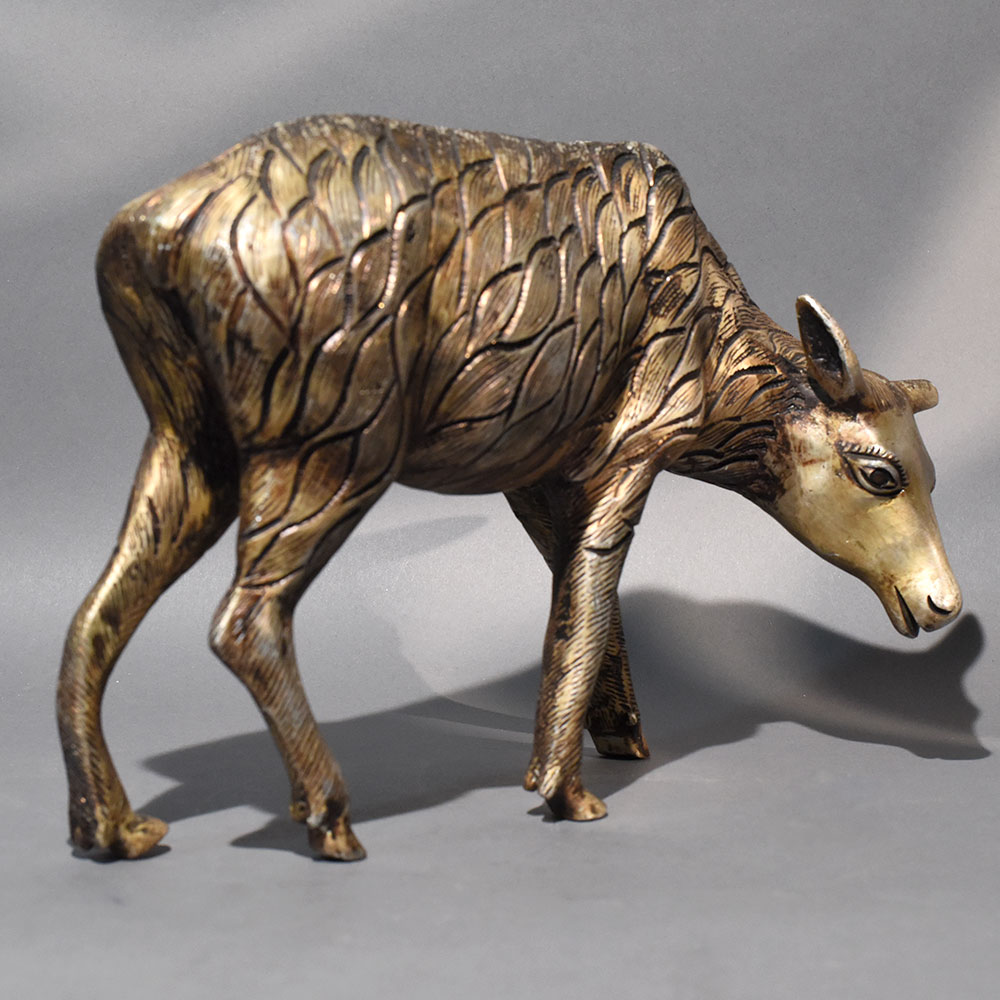 This textured brass grazing cow handcrafted sculpture captures the quiet elegance of a pastoral moment through intricate metal artistry. Designed in a lowered-head posture as if gently grazing, the figure conveys calm movement and grounded presence. The flowing engraved patterns across the body resemble layered foliage or feather-like textures, adding remarkable visual depth and character. The sculptures face is smoothly contoured with softly defined eyes and delicate horn detailing, creating a refined contrast against the richly patterned torso. The antique brass finish features natural tonal shading that enhances the carved textures and highlights the organic lines of the form. The balanced leg positioning ensures stability while maintaining a realistic stance. Crafted using traditional casting methods, this handcrafted brass cow sculpture reflects both artistic precision and cultural symbolism. The cow is widely regarded as a symbol of nourishment, peace, and abundance. In Decor styling, it introduces warmth and serenity, making it suitable for living rooms, office shelves, meditation corners, or heritage-inspired interiors. Its elongated design allows it to stand gracefully on console tables, cabinets, or display units. The solid brass material ensures durability and long-lasting finish retention, while subtle variations in tone affirm its handmade authenticity.