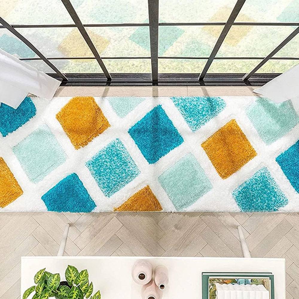 This handcrafted shaggy rug combines mustard yellow, turquoise, and white in a modern diamond pattern that brightens any interior. Its soft polyester fibers and playful palette create both comfort and visual charm — perfect for stylish homes. Each piece is packed and quality-checked by Indianshelf artisans.