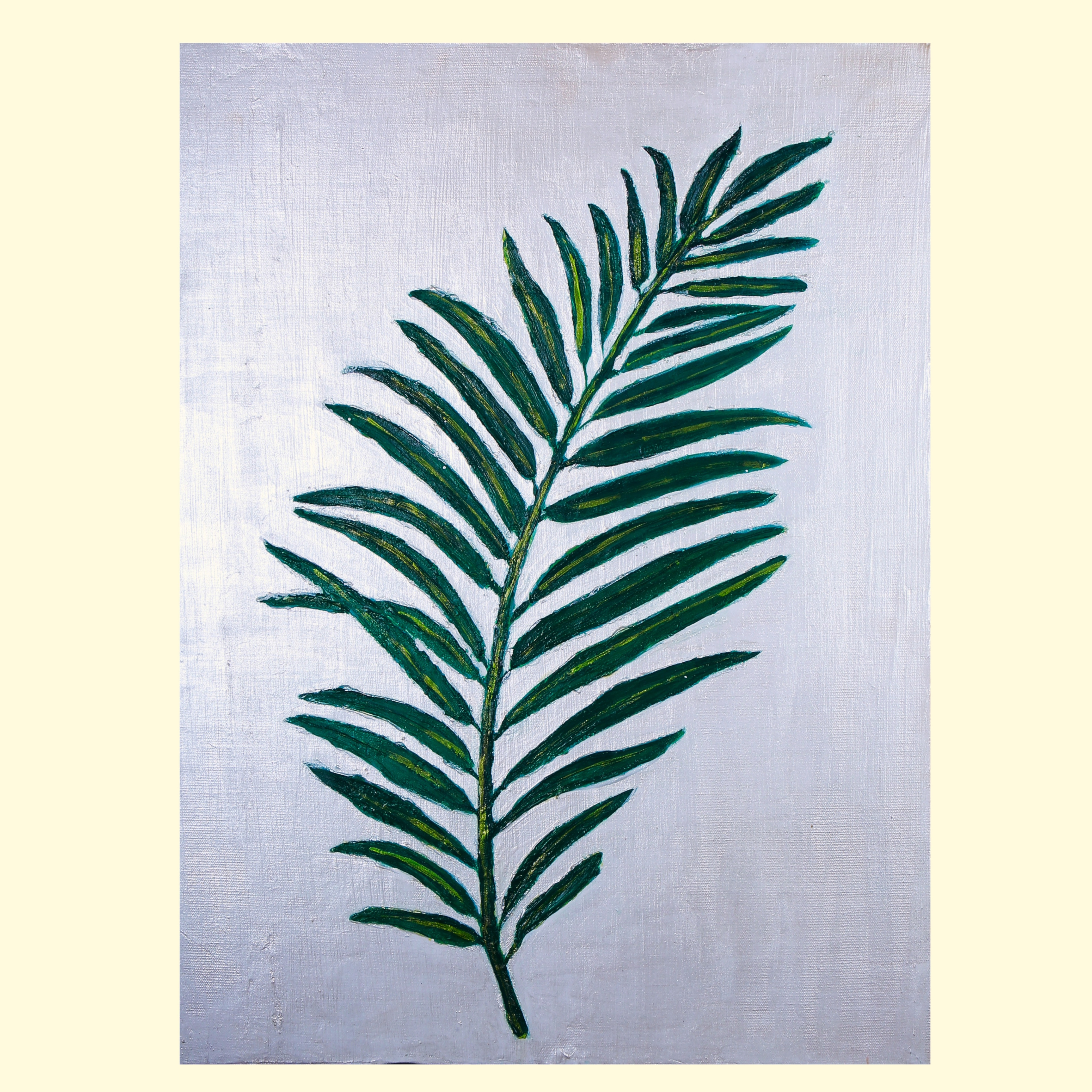 "The Calm Leaf" is a serene textured painting that captures the quiet elegance of a single green frond set against a pearl-toned background. The raised texture of the leaf adds depth and dimension, inviting the viewer to not only see but almost feel the natural form. The lush green strokes are layered with gentle variation, symbolizing growth, tranquility, and connection to nature. The pearl background subtly shifts with the light, adding a soft, luminous quality that enhances the calm ambiance of the piece. This artwork is a gentle reminder of nature’s quiet strength and the peace found in simplicity.