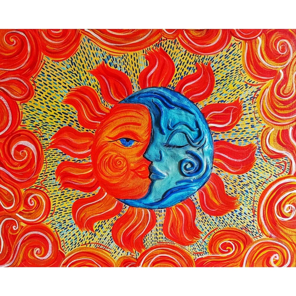 A vibrant hand-painted artwork representing the mystical union of the Sun and Moon. The piece symbolizes harmony, balance, and cosmic love — the fiery warmth of the sun merging with the calm serenity of the moon. Bright swirling strokes of red, orange, yellow, and blue create an energetic yet soothing visual experience. Perfect for home décor, meditation spaces, or as a statement art piece.