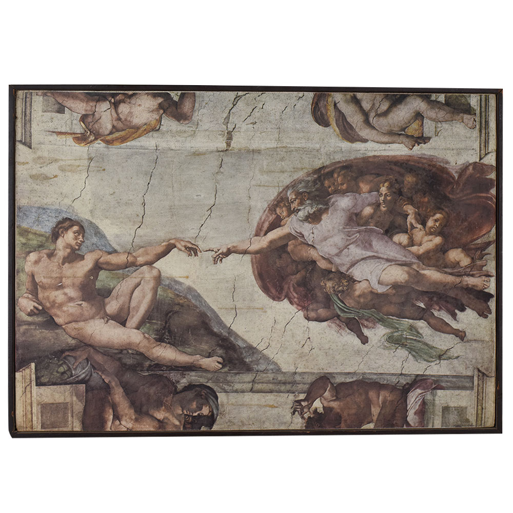 This paper print features The Creation of Adam, one of the most iconic frescoes painted by Michelangelo on the ceiling of the Sistine Chapel in Vatican City, completed circa 1512. The masterpiece depicts the biblical moment from the Book of Genesis when God gives life to Adam, the first man. The central focus is on the almost-touching hands of God and Adam, a powerful symbol of divine creation, human potential, and the connection between the earthly and the divine. On the left, Adam reclines with a relaxed, yet expectant posture, his muscular form reflecting Michelangelo’s mastery of anatomy and Renaissance ideals of beauty. On the right, God is shown dynamically reaching out, surrounded by a host of angels and figures, his flowing robe and intense gaze conveying purposeful energy. The composition’s tension lies in the small gap between their fingertips, capturing a moment of anticipation and profound significance. Rendered with careful attention to the original’s colors, detail, and texture, this paper print retains the timeless grandeur of Michelangelo’s work. The visible crack lines add to its authenticity, evoking the age and history of the original fresco. Perfect for art lovers, history enthusiasts, and collectors of classical masterpieces.