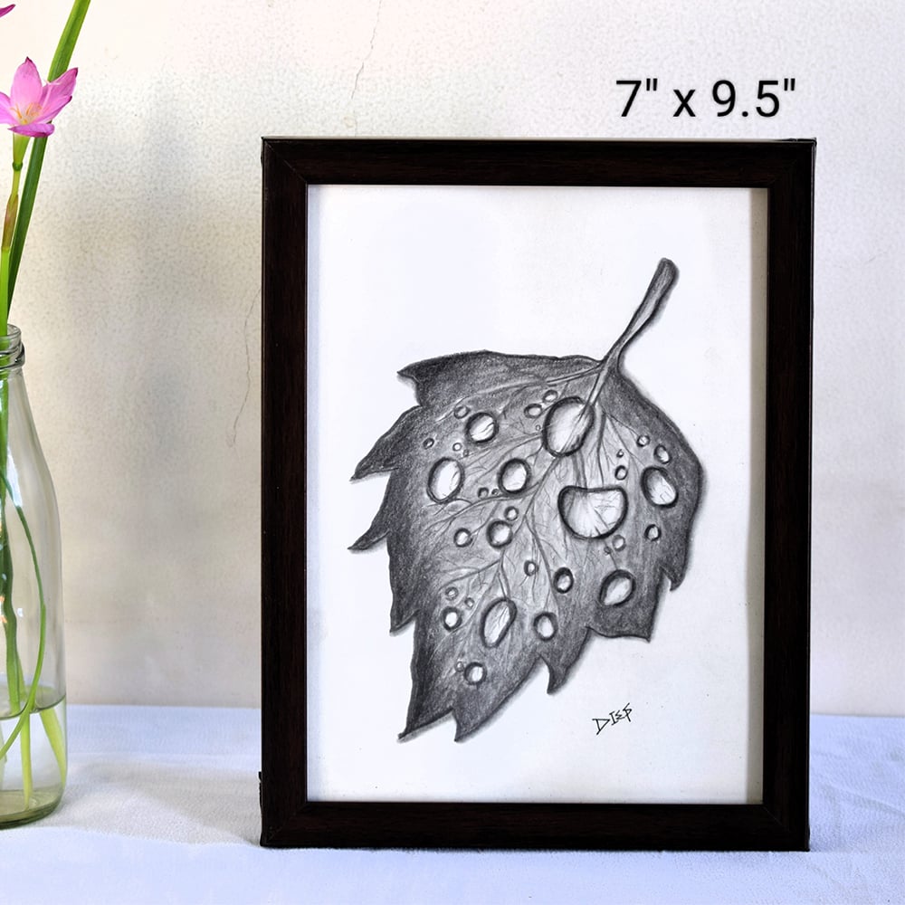 • The Droplets on Leaf Realistic Pencil Sketch on Paper by Artist Dimpana | 7 x 9.5 Inches