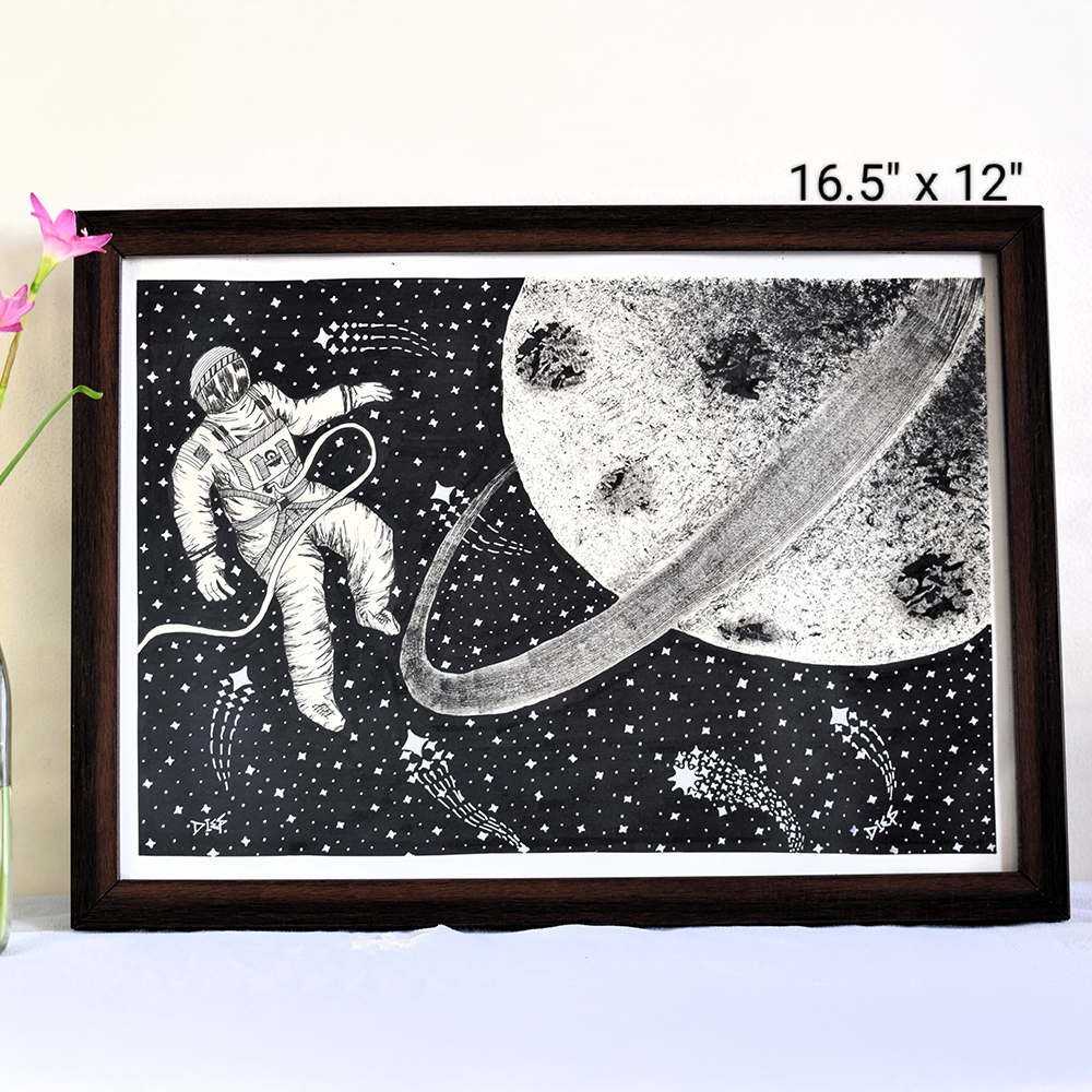 This monochrome artwork depicts a mesmerizing outer space scene featuring an astronaut drifting near a textured planet with rings, surrounded by stars and comets. Handcrafted with Indian ink on paper by Artist Dimpana, the composition captures the solitude, scale, and wonder of the cosmos in exquisite detail.