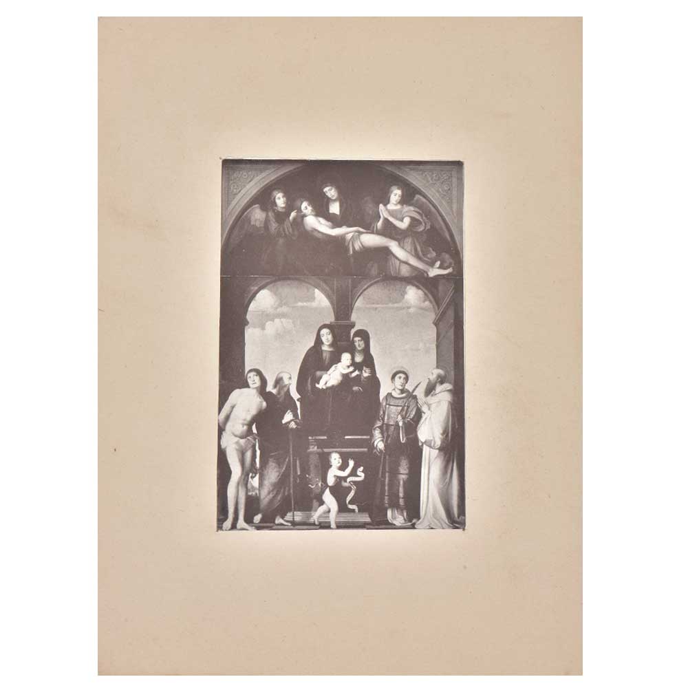 Saints Sebastian and Paul are shown on the left; Saints Lawrence and Benedict are included on the right. On the capital in the centre is a sculpture showing the Sacrifice of Isaac. This picture and its lunette showing the 'Pietà', formed the altarpiece in the Chapel of Saint Anne in S. Frediano, Lucca.