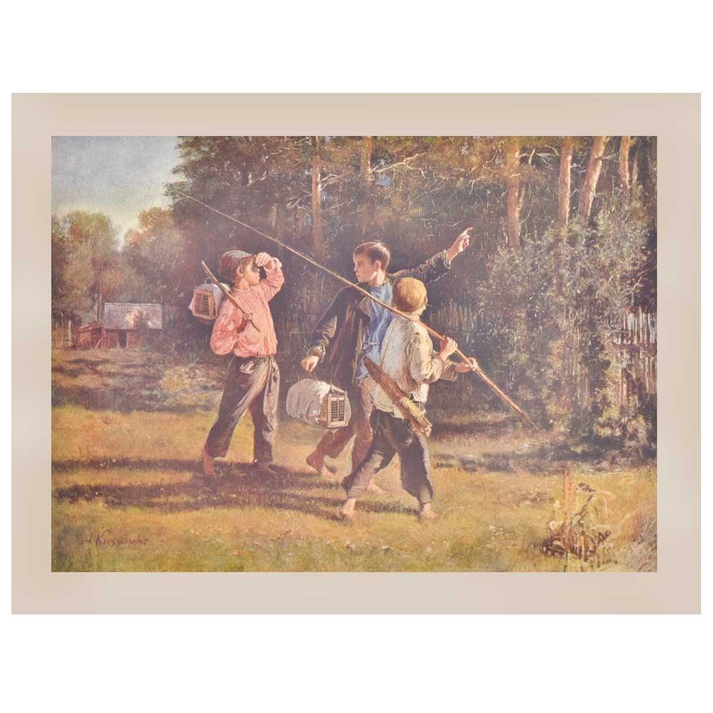 The Print shows three teenage kids on a bright sunny day going out for fishing they have a fishing rod ,Cage and sticks in their Hands .One of the boy seems to be leading the other two as he is seen showing them direction .The background shows forest backgroung with a lot of greenery.