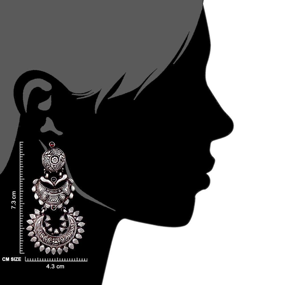 Three layered 92.5 Sterling Silver Earrings with traditional engraved design . The three layers are of chandbali design with design on the outline of the chqandbli design . Semi precious pink fuchsia jade stone add pop of color the oxidized earring. Wear it for your first date , candle lit dinner, valentine day and team it up with a nice sari or lehenga or even faded jeans.