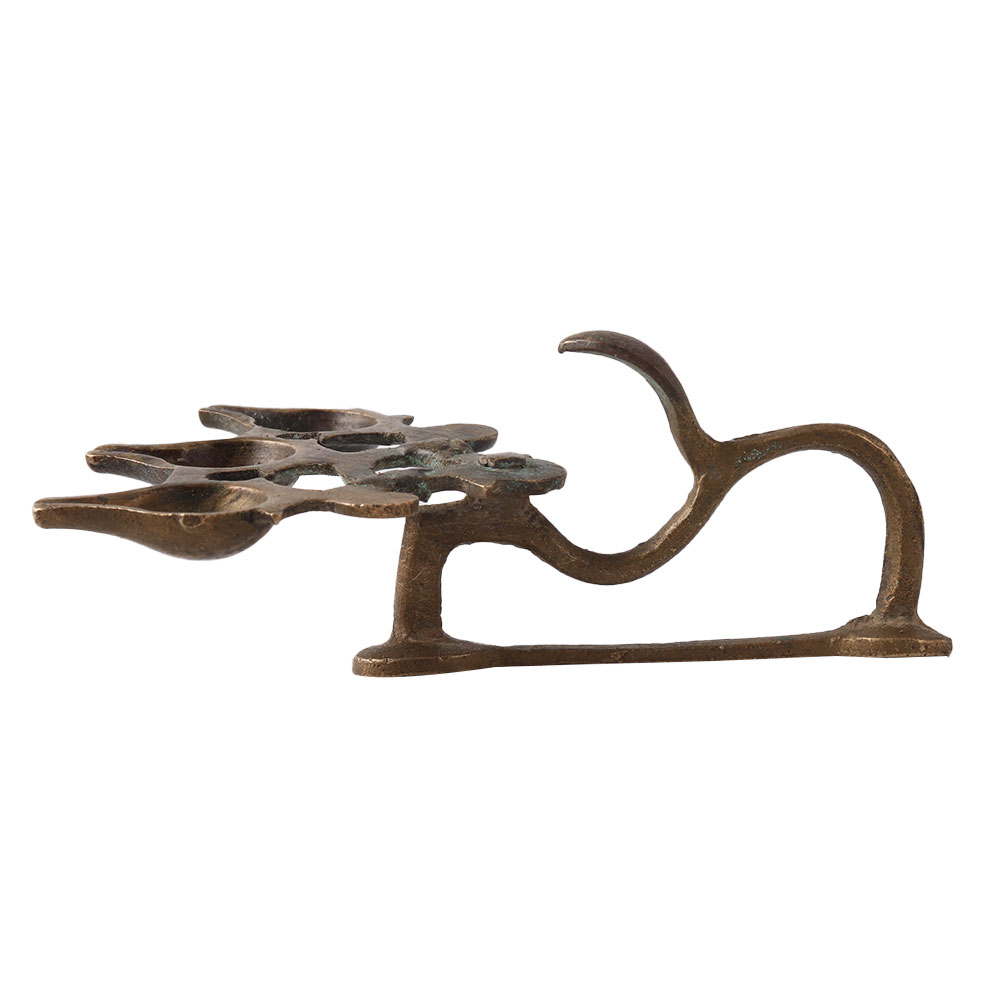 A three wick arti lamp with a handle was employed in this vintage's house, mandir, and office décor. It can also be used to bestow supernatural blessings on a loved one as a good luck present. The vintage used little arti lamp with handle was made by master Indian artisans and represents goodness and purity. Bring this lovely diya home to enliven your space and add a touch of class.