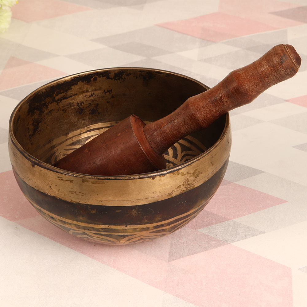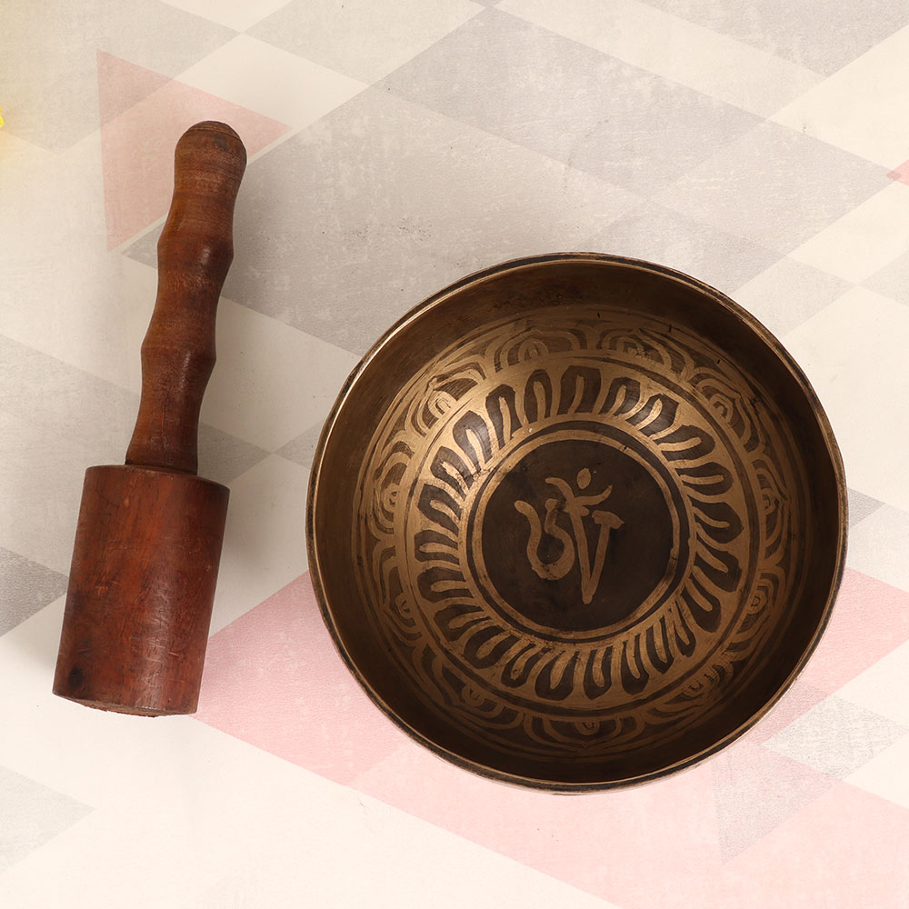 Adorn your interior with the timeless allure of our Vintage Bell Metal Om Singing Bowl that is exquisitely handcrafted by skilled Tibetan artisans. This extraordinary piece showcases an antique brown finish that exudes rustic charm and is sure to captivate onlookers. Crafted from high-quality bell metal, this singing bowl is more than just an aesthetic addition; it's a versatile and meaningful instrument. The soothing sound produced by striking the bowl with the included wooden mallet can promote relaxation, meditation, and mindfulness. The resonating "Om" symbol holds spiritual significance, making this bowl a wonderful addition to your spiritual practice or yoga sessions. This versatile piece is a perfect fit for any environment, be it your home, office, restaurant, hotel, or shop, adding an element of tranquillity and visual appeal. Furthermore, it's a delightful addition to any vintage collection, adding a touch of heritage and craftsmanship. Make a memorable gesture by gifting this unique singing bowl to your loved ones on special, festive, or auspicious occasions.